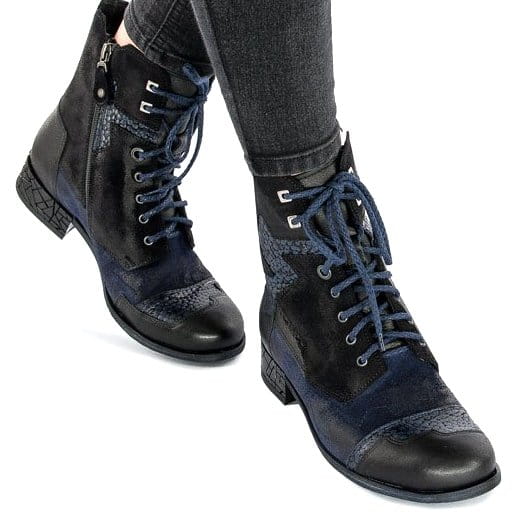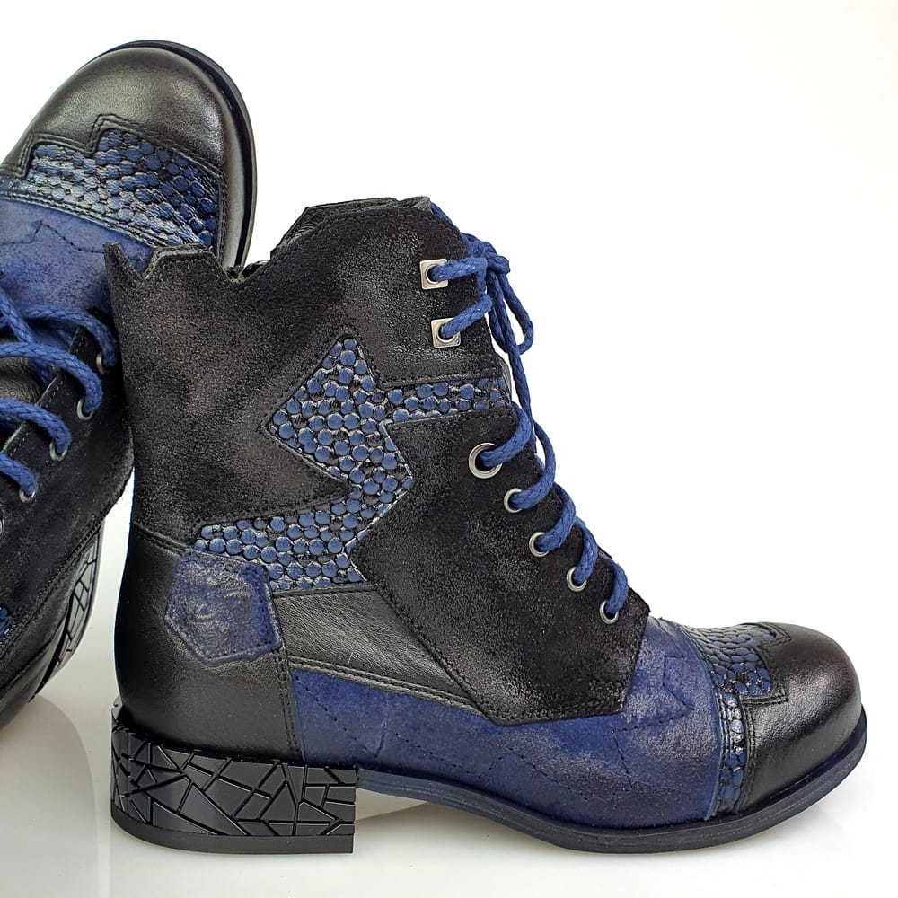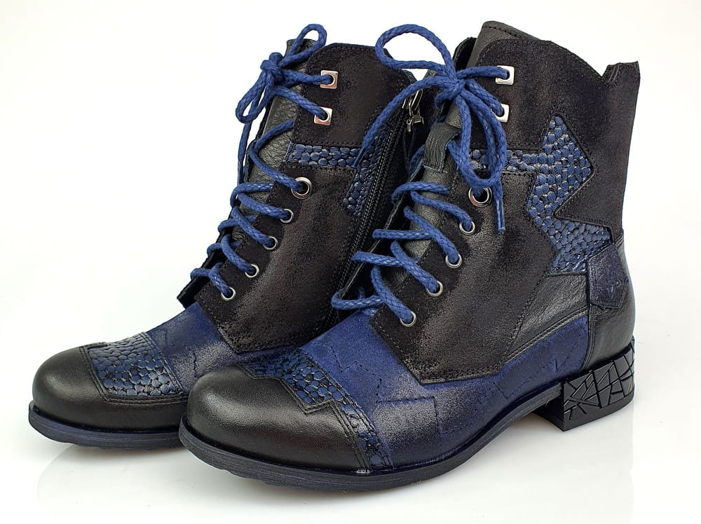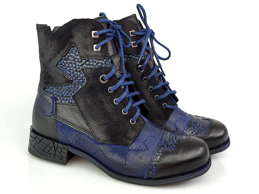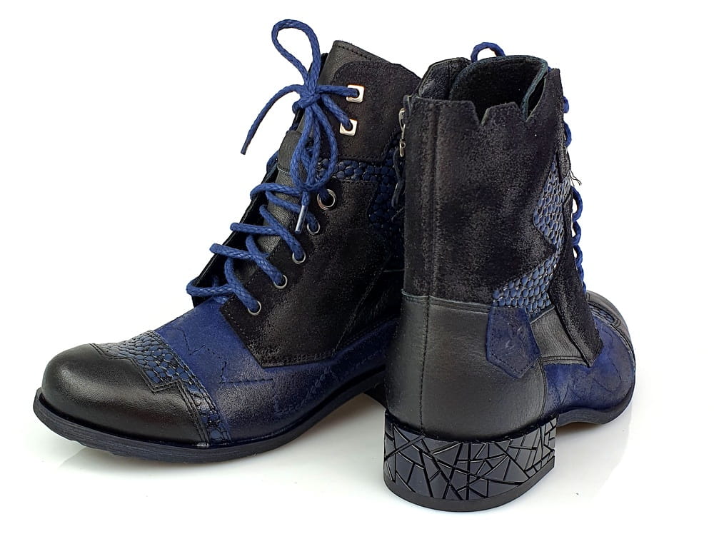 Botki wykonane z naturalnej skóry licowej i nubukowej w kolorze granatowym i czarnym.