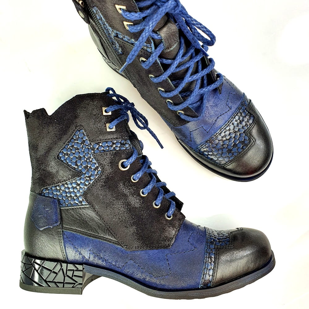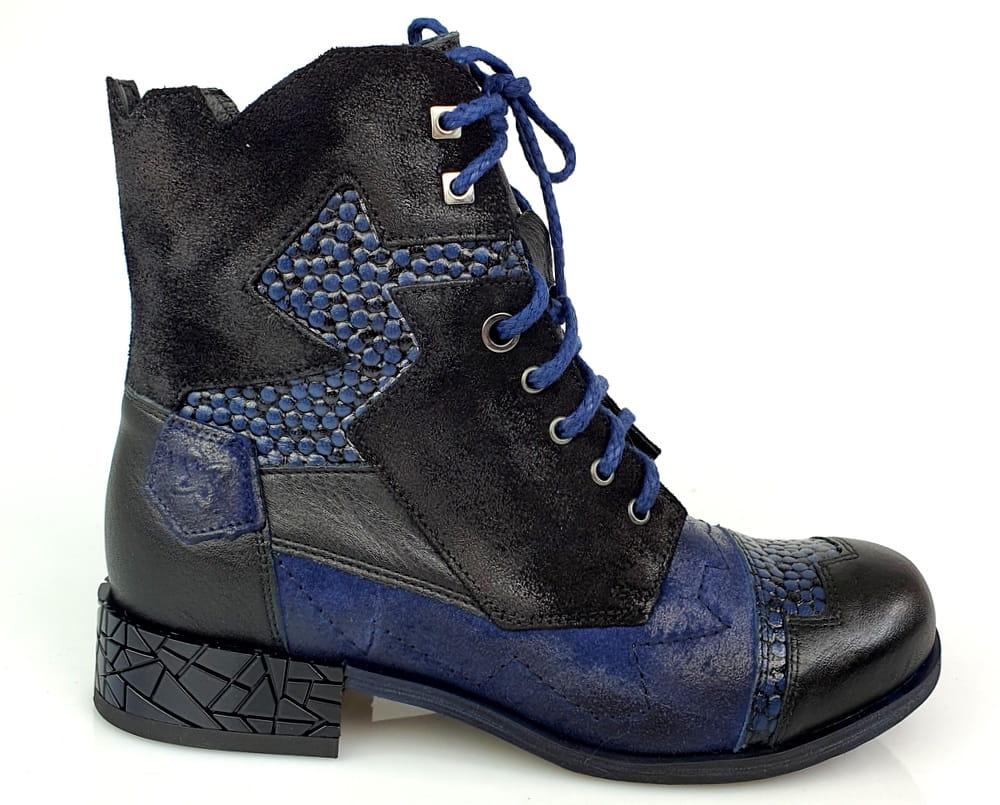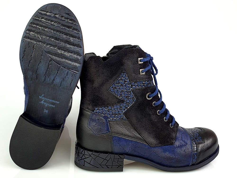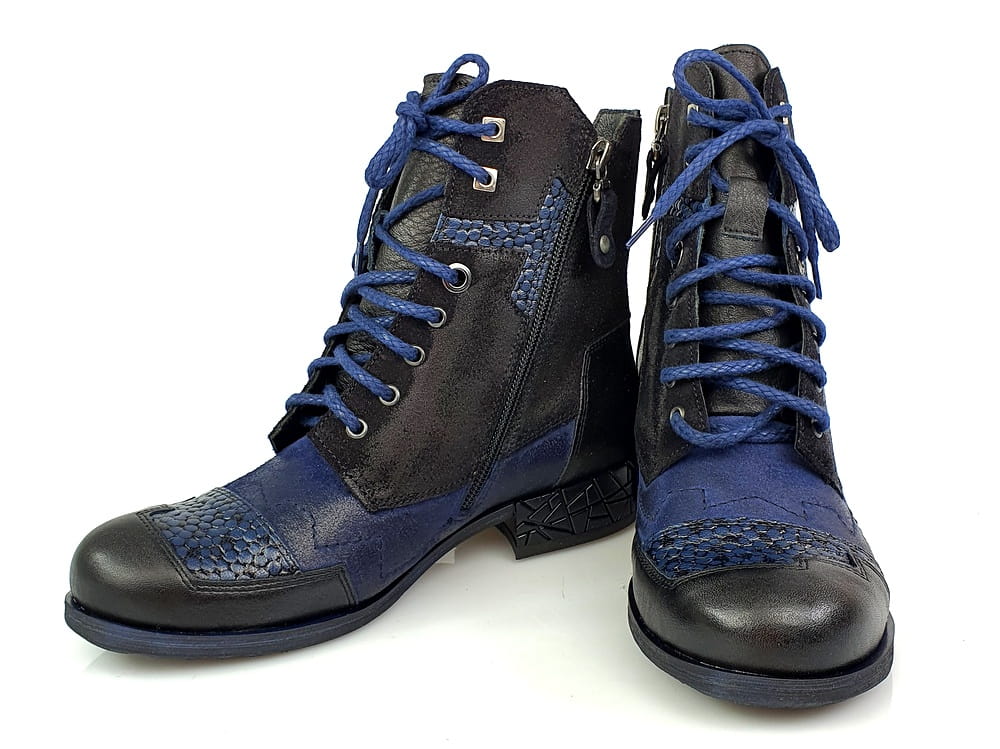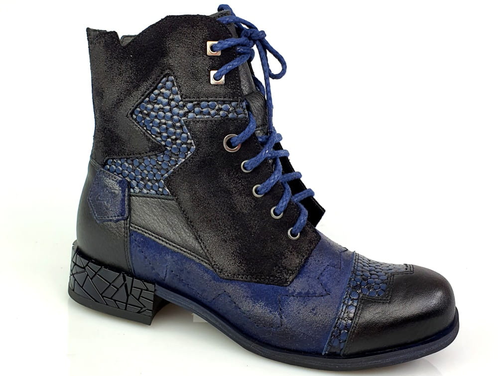 Botki wykonane z naturalnej skóry licowej i nubukowej w kolorze granatowym i czarnym.