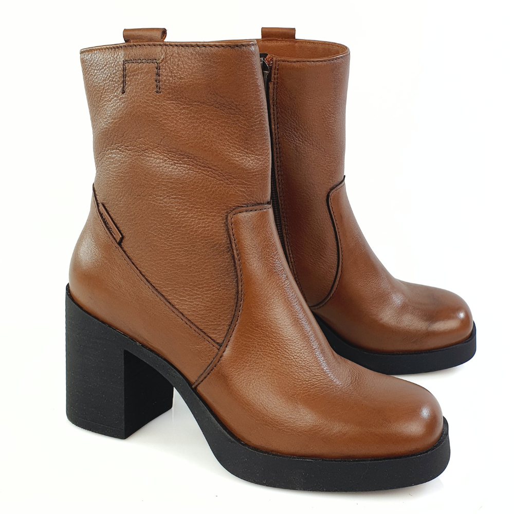 Model 23511 to nowoczesność i klasyka: nowoczesny kształt i gruba podeszwa oraz skóra naturalna w kolorze brązowym (odcień koniak). Wnętrze buta jest z tkaniny, miłej w dotyku jak miękki polar. Buty są zapinane na suwak. Stabilny i szeroki obcas zapewni ci wygodę i komfort długiego chodzenia.Dlaczego warto kupić piękne botki?