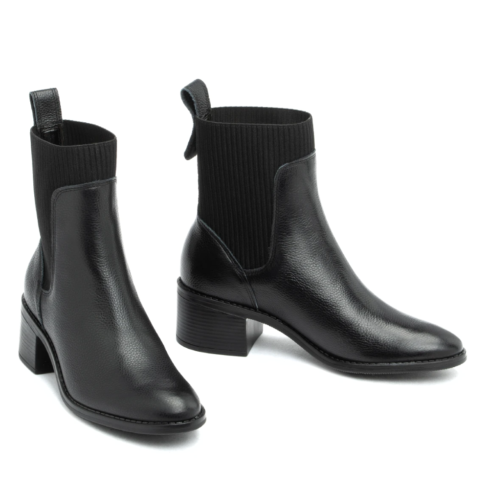 Cholewka wykonana jest z wysokiej jakości naturalnej skóry licowej, która zapewni komfort i jakość. Obcas to stabilny słupek o wysokości 5 cm, co gwarantuje komfort użytkowania nawet przez cały dzień. Buty nie są zapinane są wciągane jak skarpeta, co ułatwia zakładanie butów. Nosek jest okrągły, dzięki czemu palce mają swobodę. Podeszwa jest miękka i elastyczna. Te botki są w kolorze czarnym.