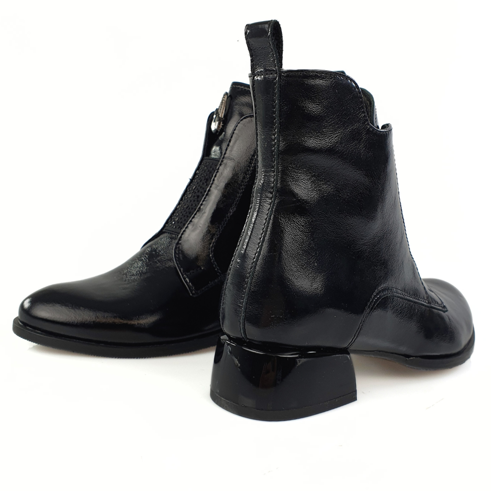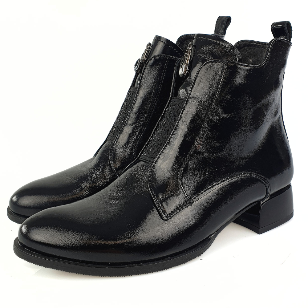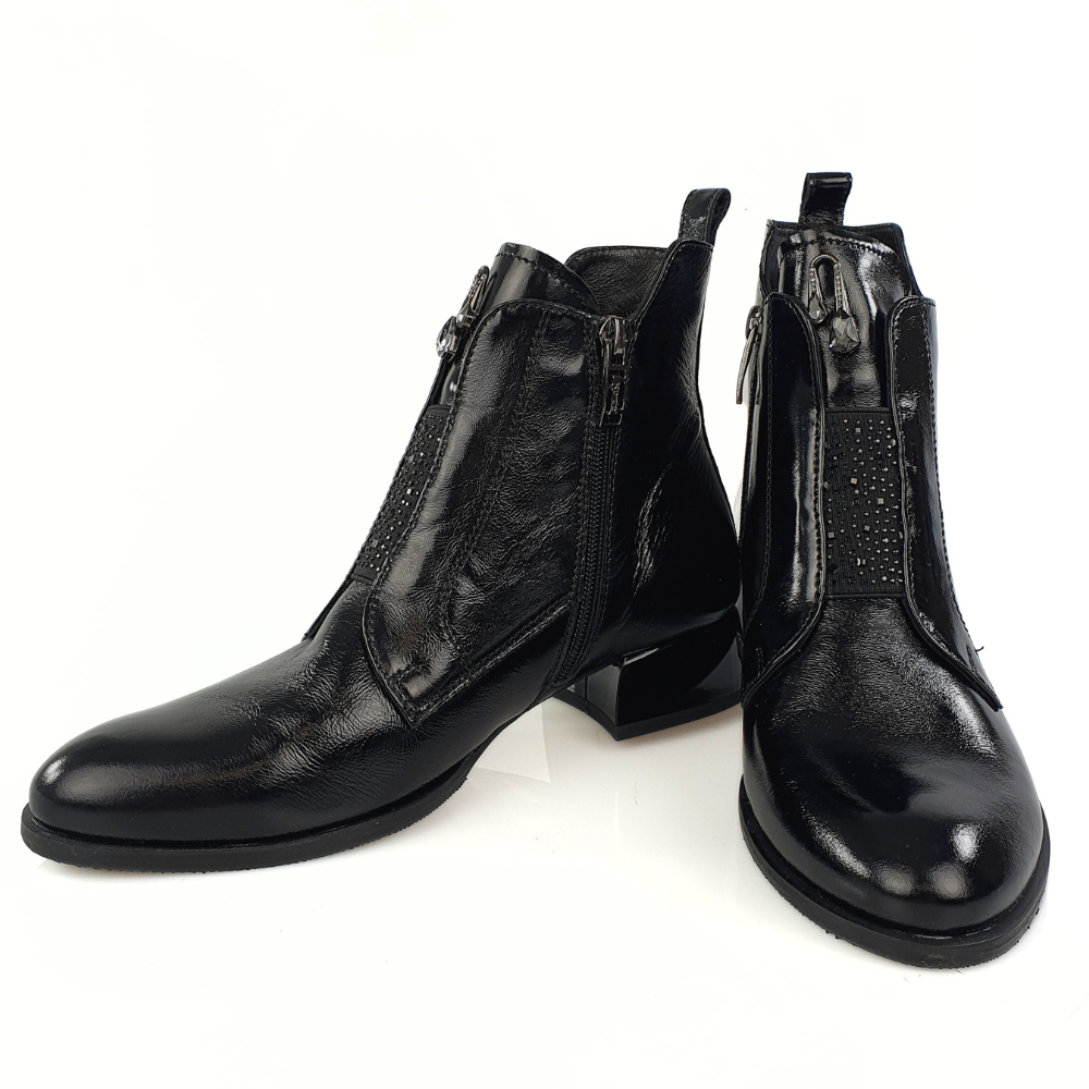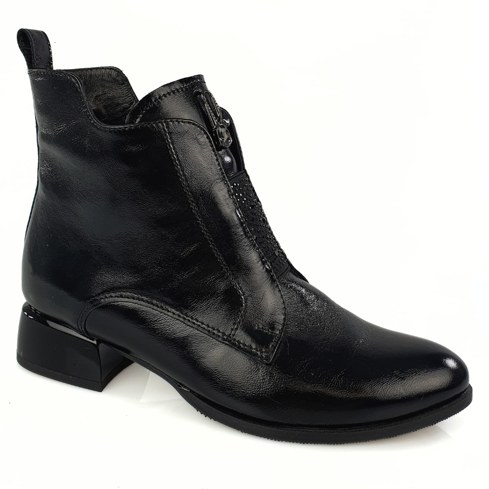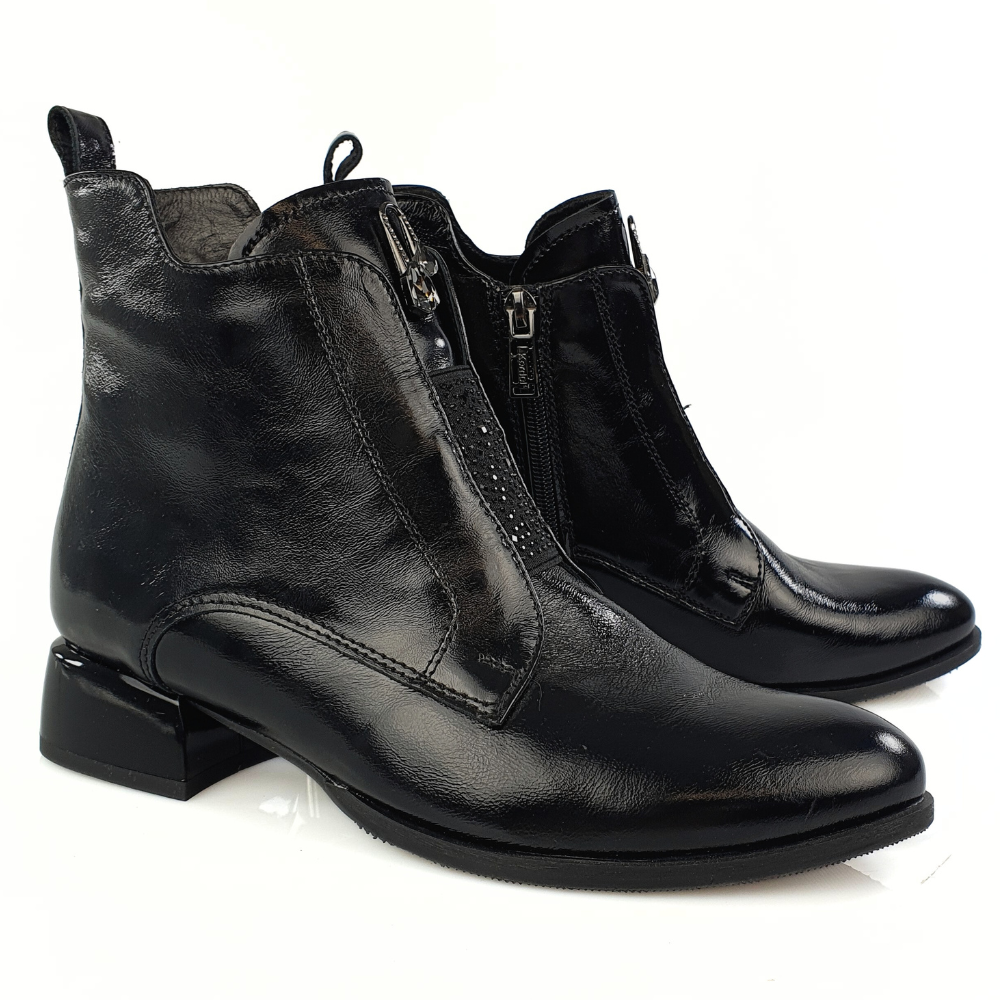 Zaletą botków w modelu 2434 jest doskonale dopracowany wzór- botki dobrze dopasowują się do stopy i świetnie się na niej układają podczas chodzenia. Botki wykonane są z naturalnej skóry lakierowanej, która zapewni stopom wygodę i przewiewność. Botki są zapinane na suwak a ozdobna gumeczka wszyta z przodu dodaje cholewce elastyczności. Płaski obcas ma 3 cm wysokości a całe botki mają 17 cm wysokości cholewki. Na języku błyszcząca ozdoba z dwoma kryształkami. Wewnątrz trzewików mięciutka tkanina w kolorze czarnym. Buty są nowoczesne i jednocześnie bardzo wygodne.