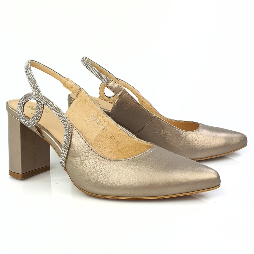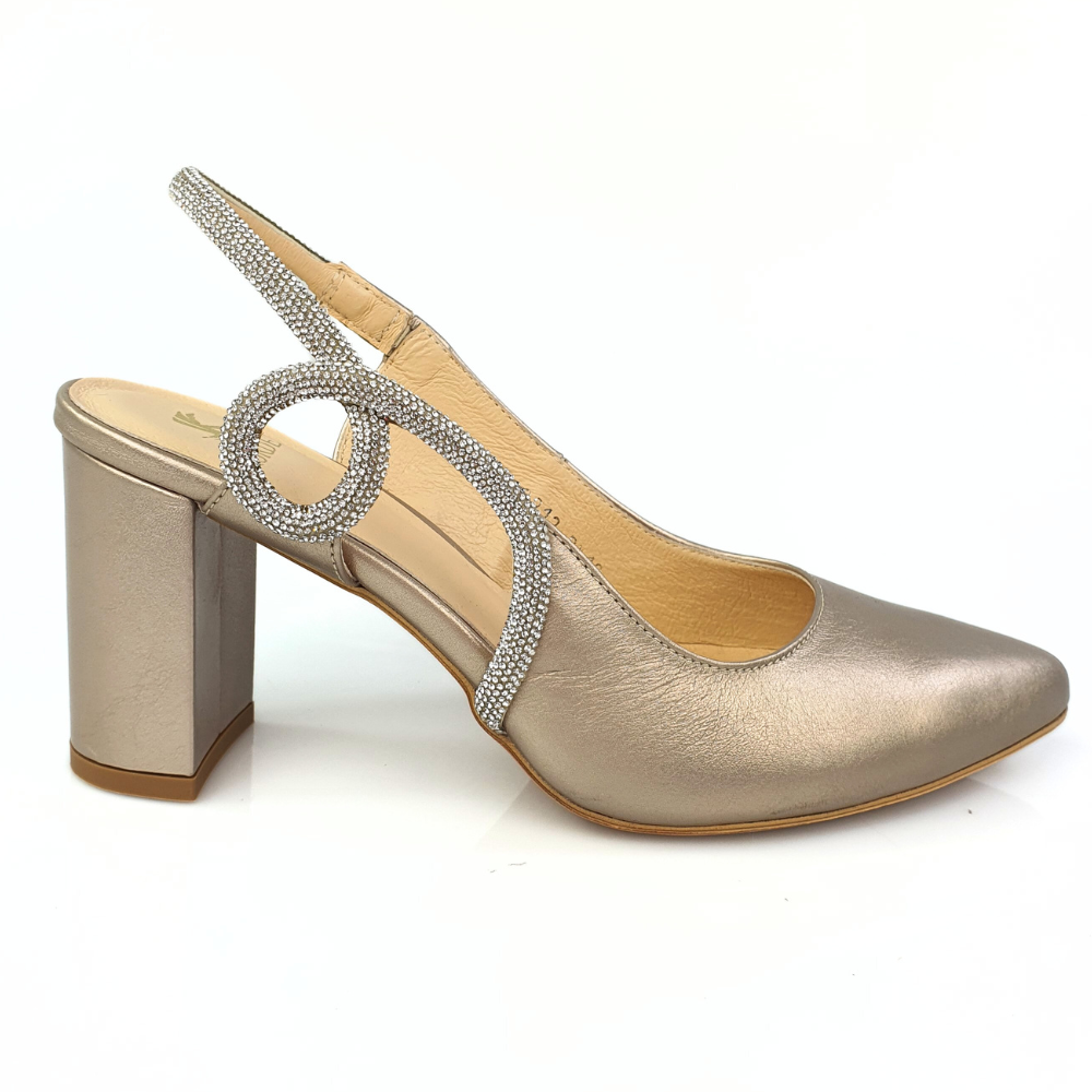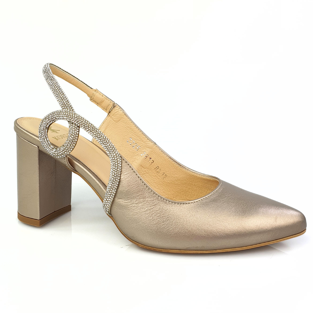 Zaletą czółenek w modelu 2813 jest cholewka wykonana z naturalnej skóry w kolorze złotym. Twoje stopy odczują komfort i miękkość wkładki ze skóry naturalnej. Odkryta pięta powoduje, że stopa dobrze układa się w bucie. Buty są bardzo dobrze wyprofilowane, stabilny obcasa słupek ma wysokość ok. 7,5 cm.