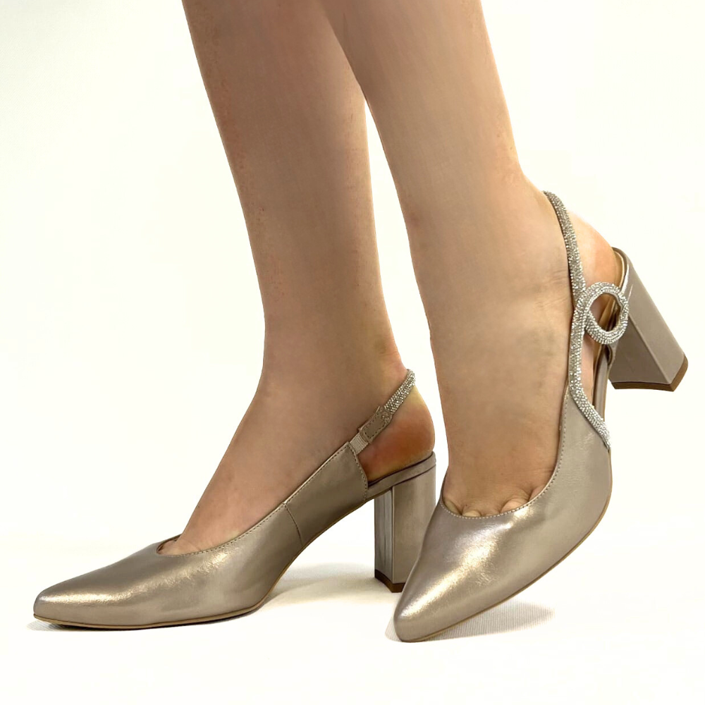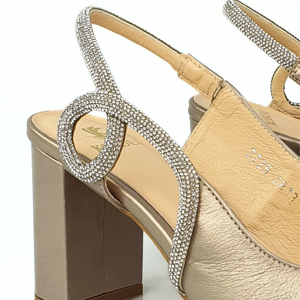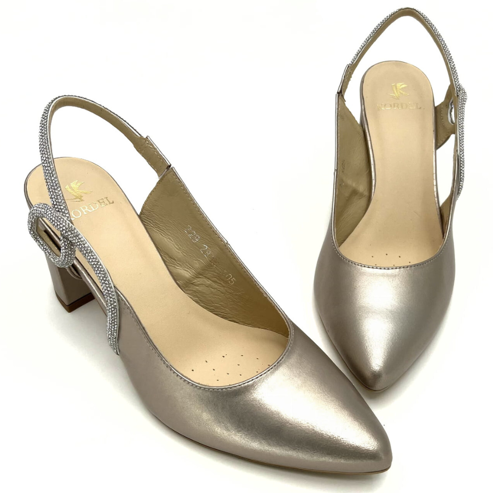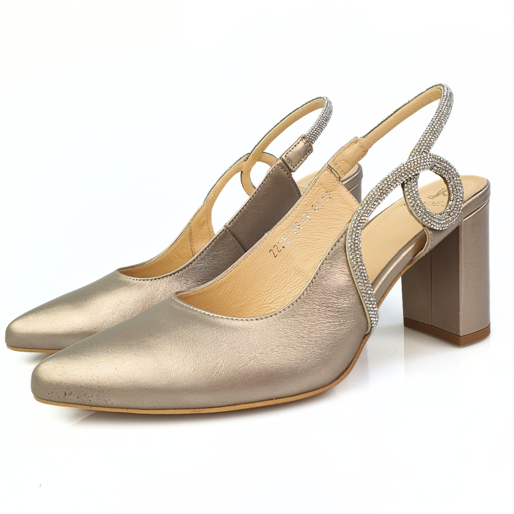 Zaletą czółenek w modelu 2813 jest cholewka wykonana z naturalnej skóry w kolorze złotym. Twoje stopy odczują komfort i miękkość wkładki ze skóry naturalnej. Odkryta pięta powoduje, że stopa dobrze układa się w bucie. Buty są bardzo dobrze wyprofilowane, stabilny obcasa słupek ma wysokość ok. 7,5 cm.