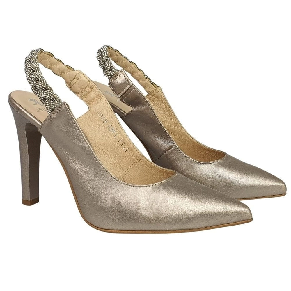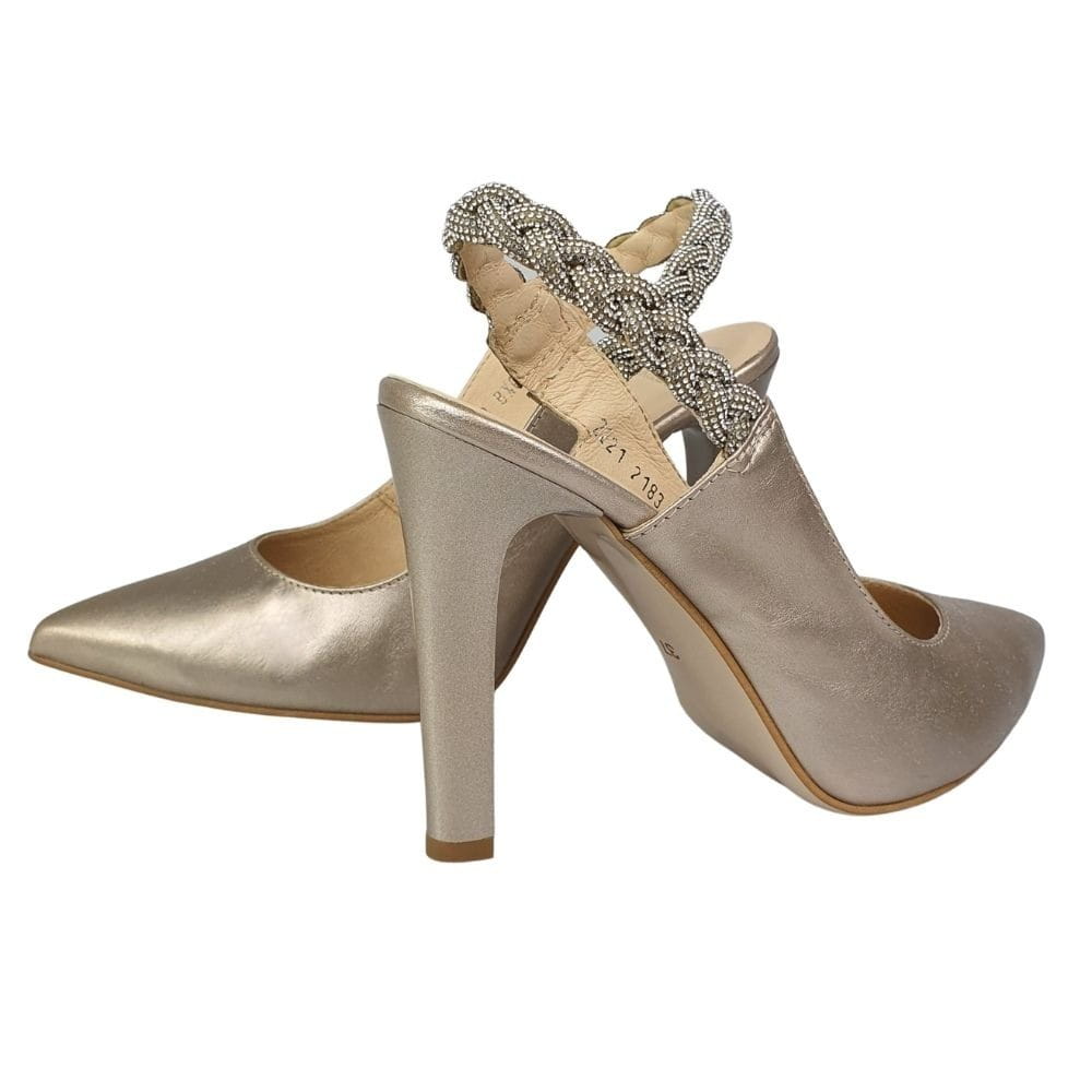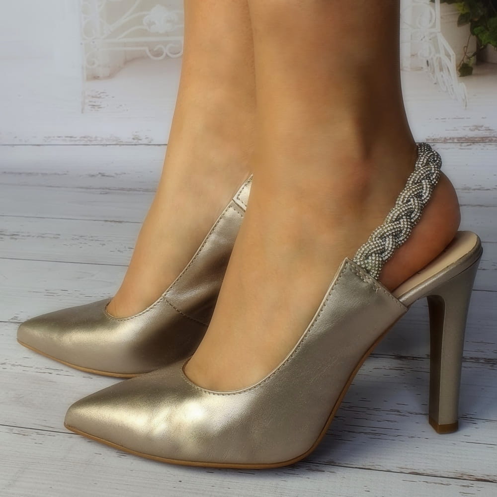 Zaletą czółenek w modelu 2183 jest cholewka wykonana z naturalnej skóry w kolorze złotym. Twoje stopy odczują komfort i miękkość wkładki ze skóry naturalnej. Odkryta pięta powoduje, że stopa dobrze układa się w bucie. Buty są bardzo dobrze wyprofilowane, stabilny obcasa szpilka ma wysokość ok. 10 cm.