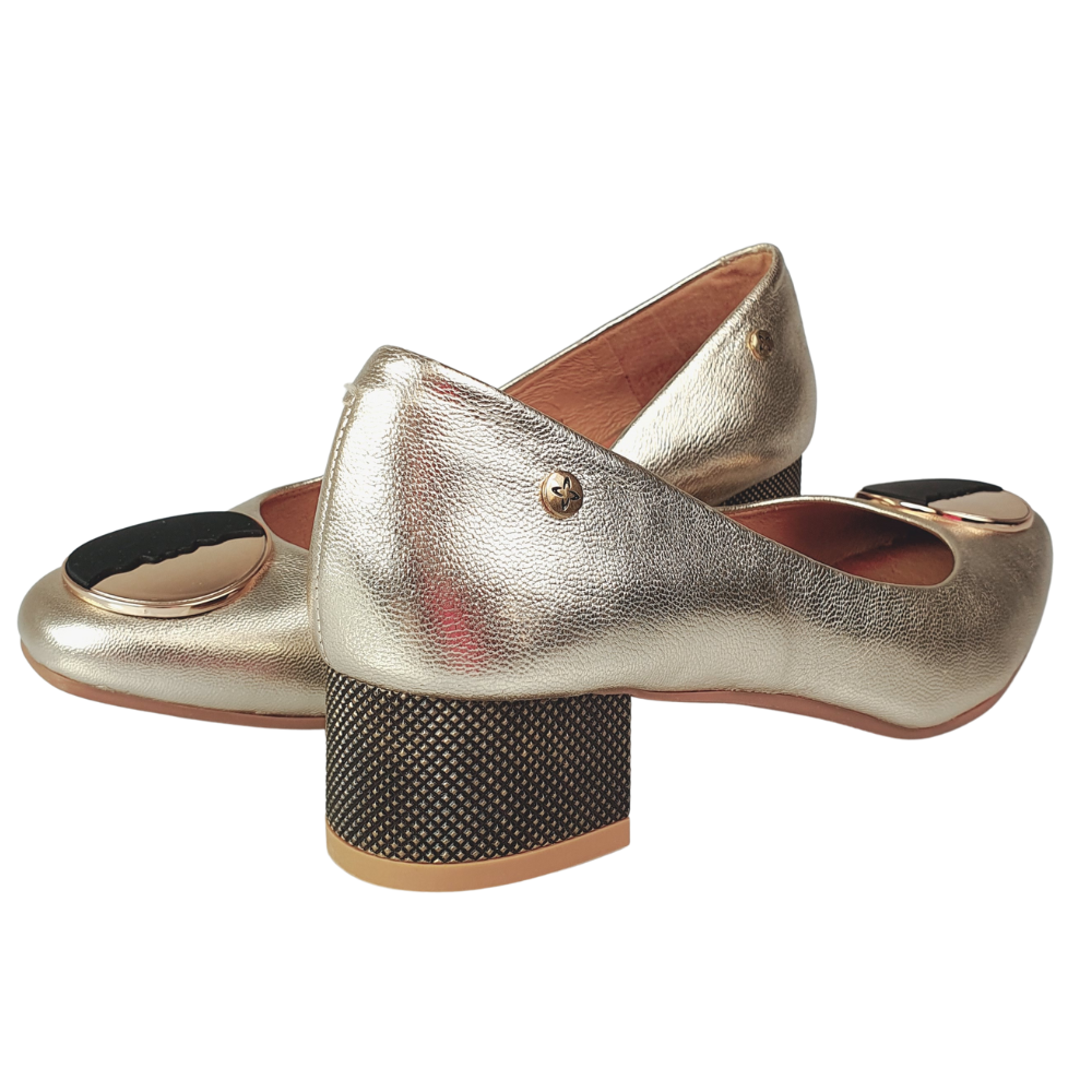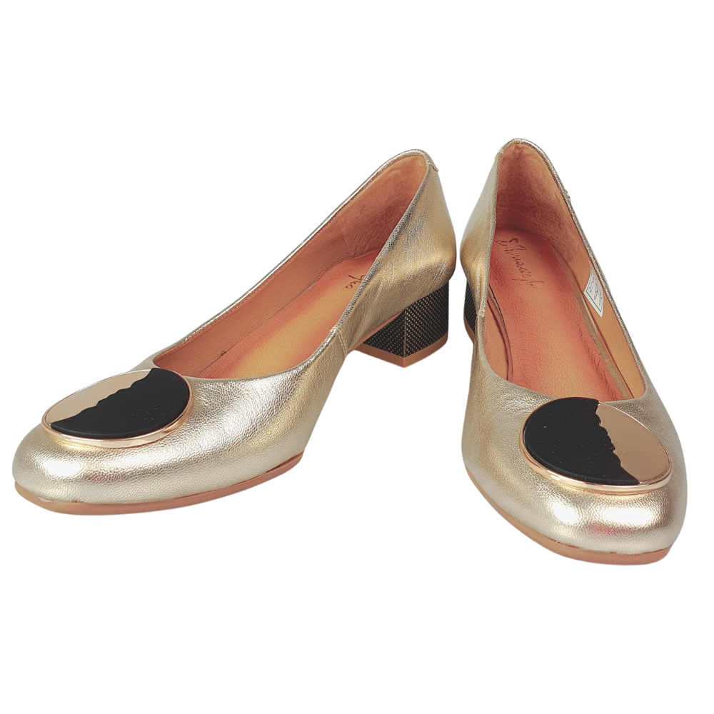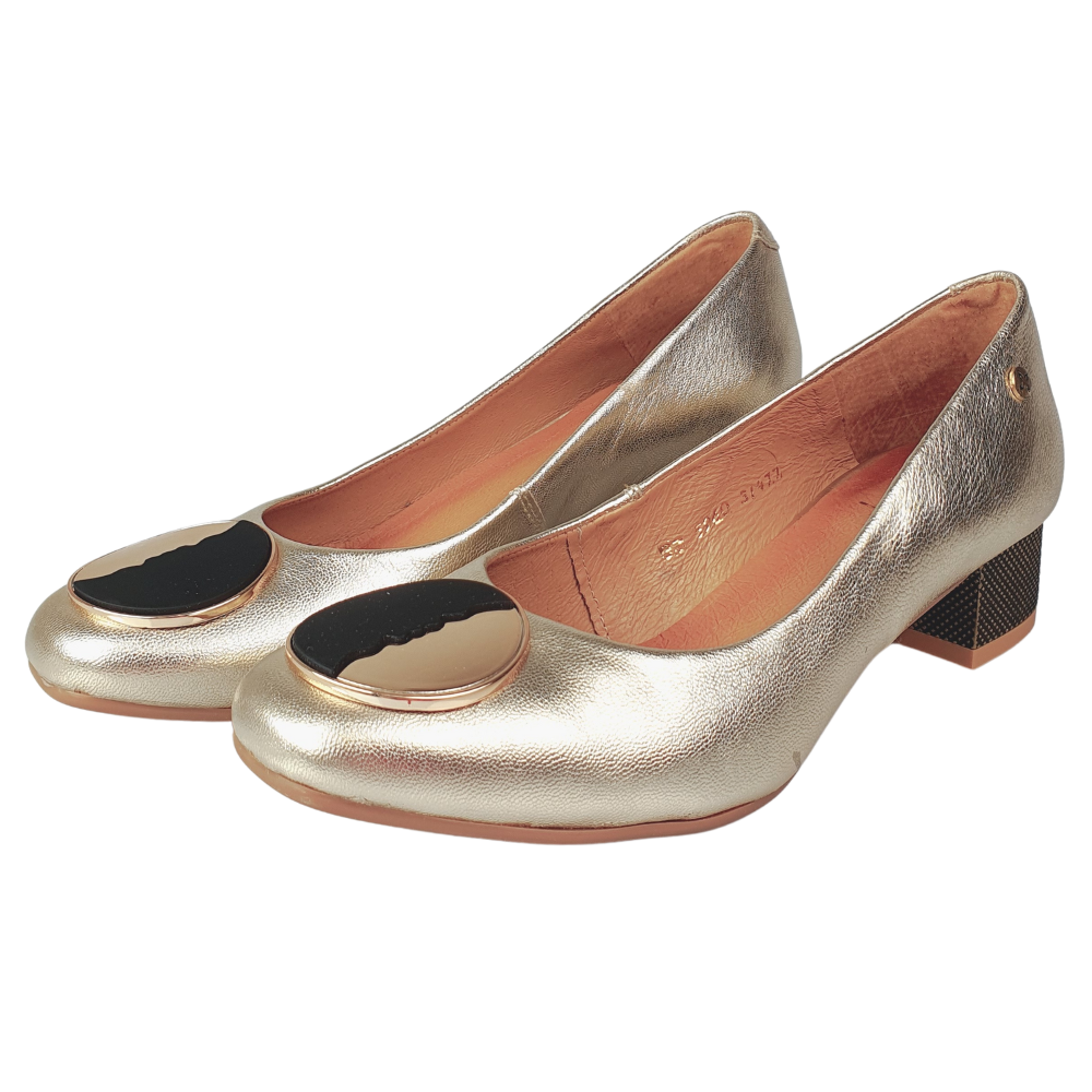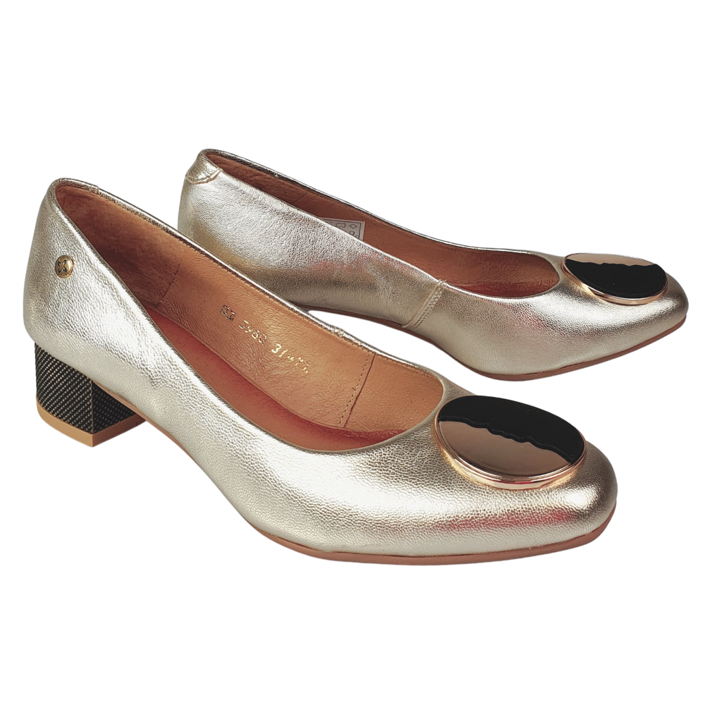 Zaletą czółenek w modelu 05960 jest wysokość obcasa - to tylko 4 cm, które dodadzą nodze smukłości i pozwolą uniknąć bólu. Obcas jest ozdobny czarno-złoty. Cholewka czółenek wykonana z naturalnej skóry, która zapewni stopom wygodę i przewiewność. Klasyczne połączenie kolorów to złota licowa cholewka i ozdoba w postaci czarno-złotego kółeczka. Twoje stopy odczują komfort i miękkość wkładki ze skóry naturalnej. Buty są bardzo dobrze wyprofilowane i wygodne.