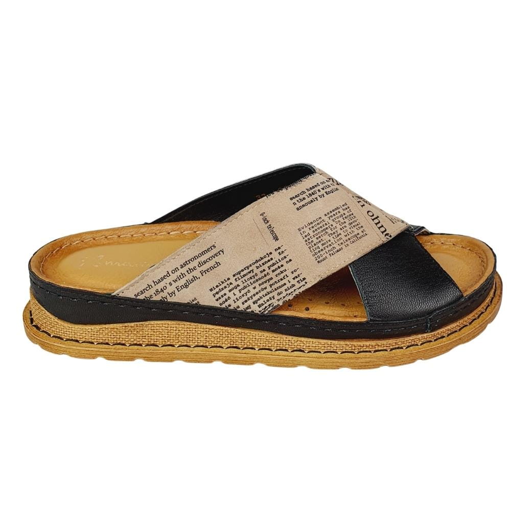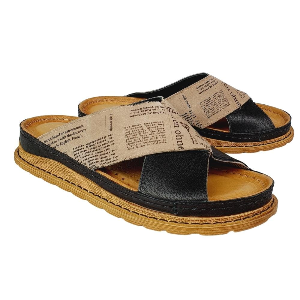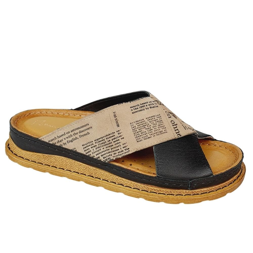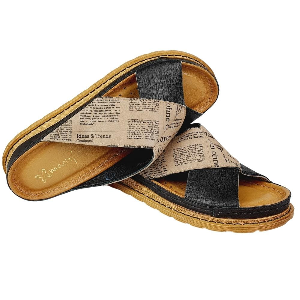 Zaletą klapków w modelu 04986 jest doskonale dopracowany wzór- klapki dobrze dopasowują się do stopy i świetnie się na niej układają podczas chodzenia. Klapki wykonane są z naturalnej skóry licowej, która zapewni stopom wygodę i przewiewność. Palce są odkryte. Gruba podeszwa to kolejny atut tych klapków. Kolor czarny w klapkach połączony jest z motywem zadrukowanej gazety. Buty są nowoczesne i jednocześnie bardzo wygodne.