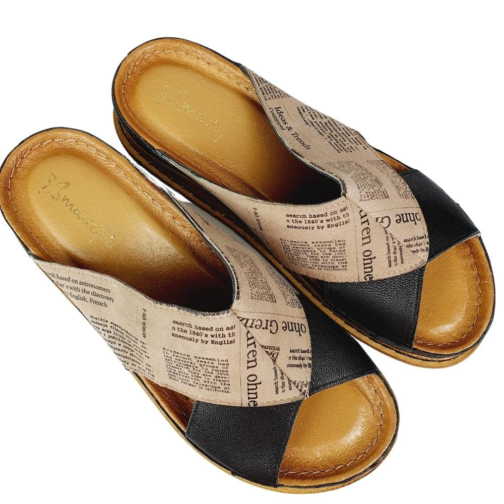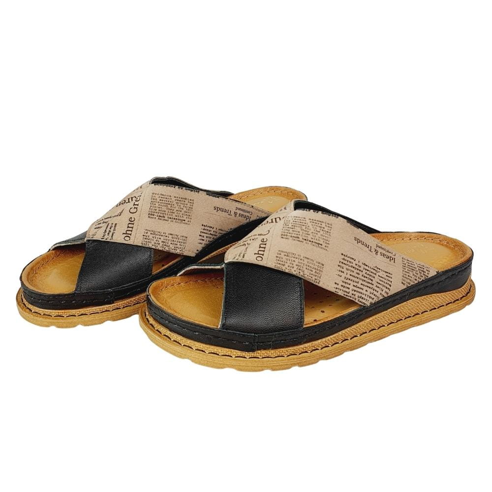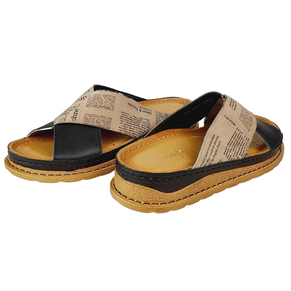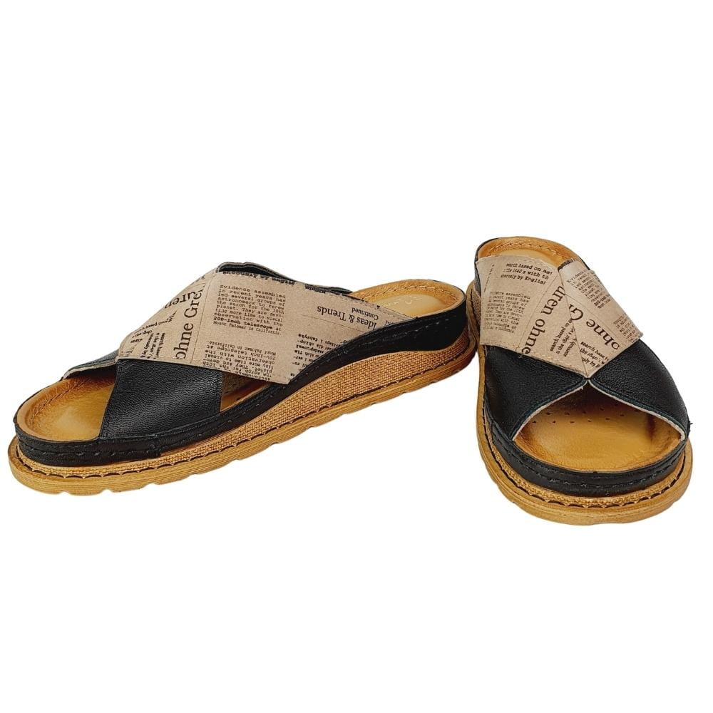 Zaletą klapków w modelu 04986 jest doskonale dopracowany wzór- klapki dobrze dopasowują się do stopy i świetnie się na niej układają podczas chodzenia. Klapki wykonane są z naturalnej skóry licowej, która zapewni stopom wygodę i przewiewność. Palce są odkryte. Gruba podeszwa to kolejny atut tych klapków. Kolor czarny w klapkach połączony jest z motywem zadrukowanej gazety. Buty są nowoczesne i jednocześnie bardzo wygodne.