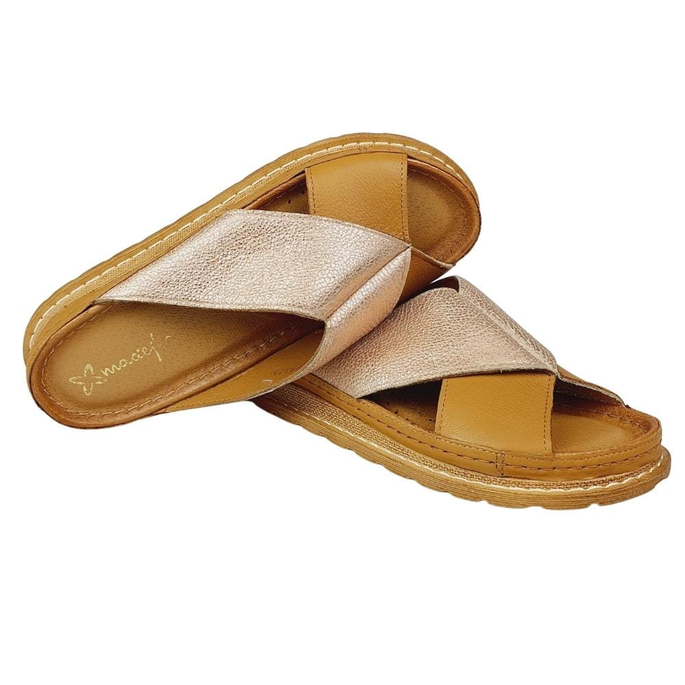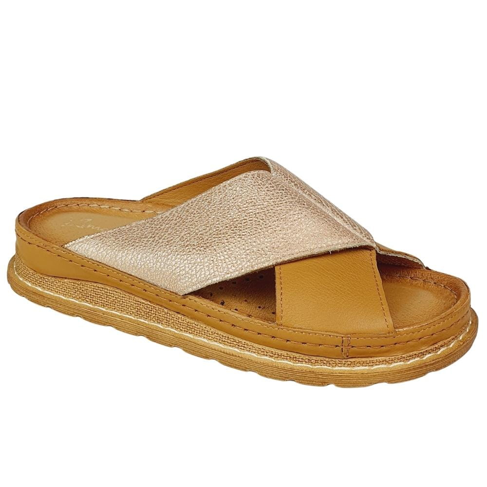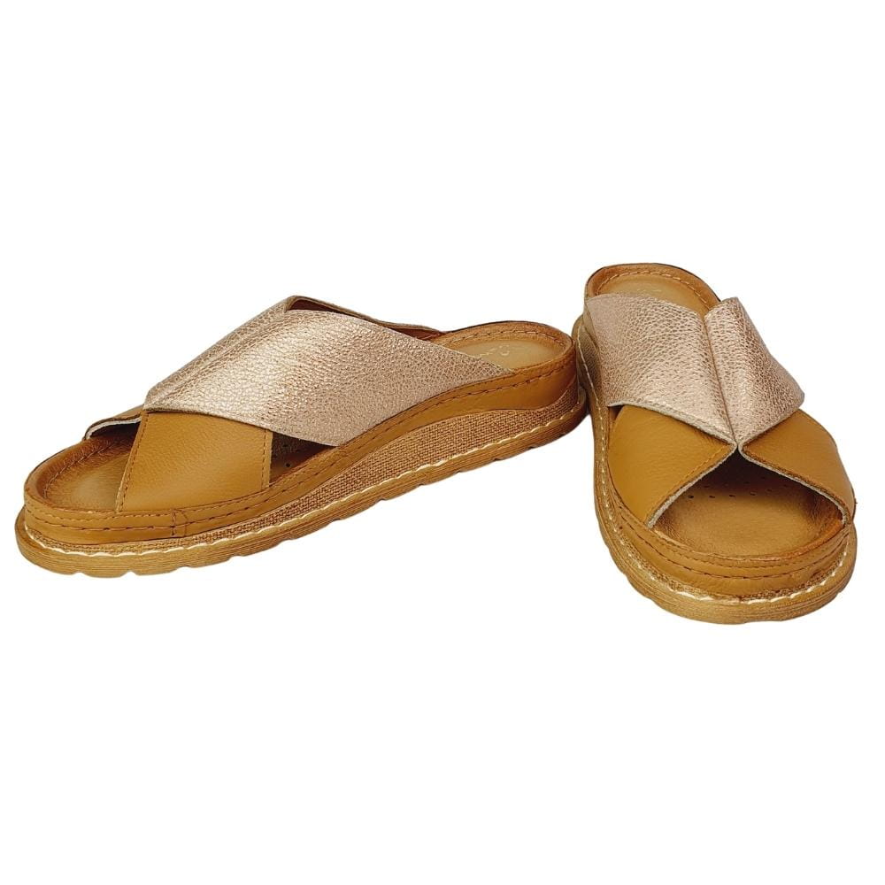 Zaletą klapków w modelu 04986 jest doskonale dopracowany wzór- klapki dobrze dopasowują się do stopy i świetnie się na niej układają podczas chodzenia. Klapki wykonane są z naturalnej skóry licowej, która zapewni stopom wygodę i przewiewność. Palce są odkryte. Gruba podeszwa to kolejny atut tych klapków. Kolor rudy w klapkach połączony jest z paskiem złotym. Buty są nowoczesne i jednocześnie bardzo wygodne.