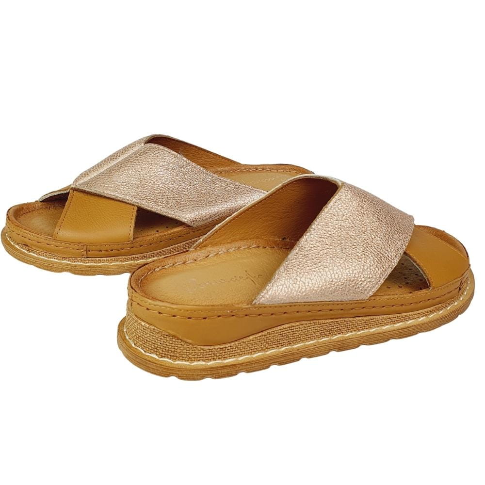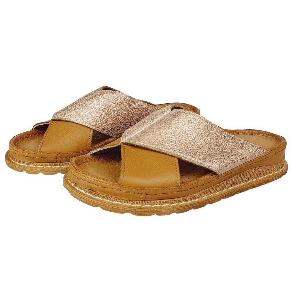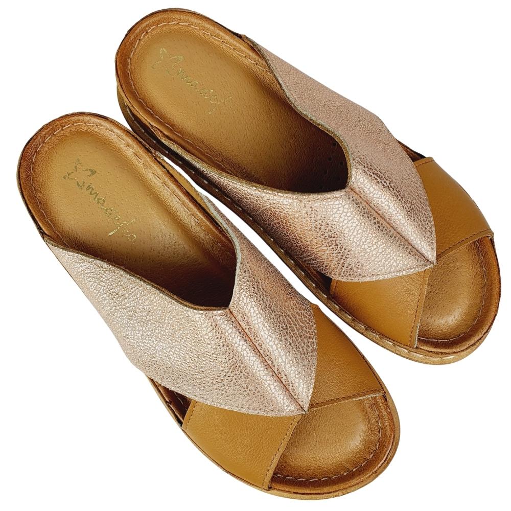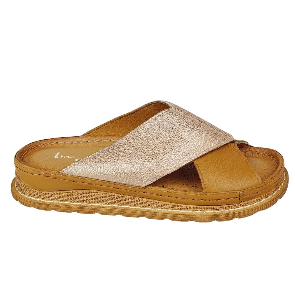 Zaletą klapków w modelu 04986 jest doskonale dopracowany wzór- klapki dobrze dopasowują się do stopy i świetnie się na niej układają podczas chodzenia. Klapki wykonane są z naturalnej skóry licowej, która zapewni stopom wygodę i przewiewność. Palce są odkryte. Gruba podeszwa to kolejny atut tych klapków. Kolor rudy w klapkach połączony jest z paskiem złotym. Buty są nowoczesne i jednocześnie bardzo wygodne.