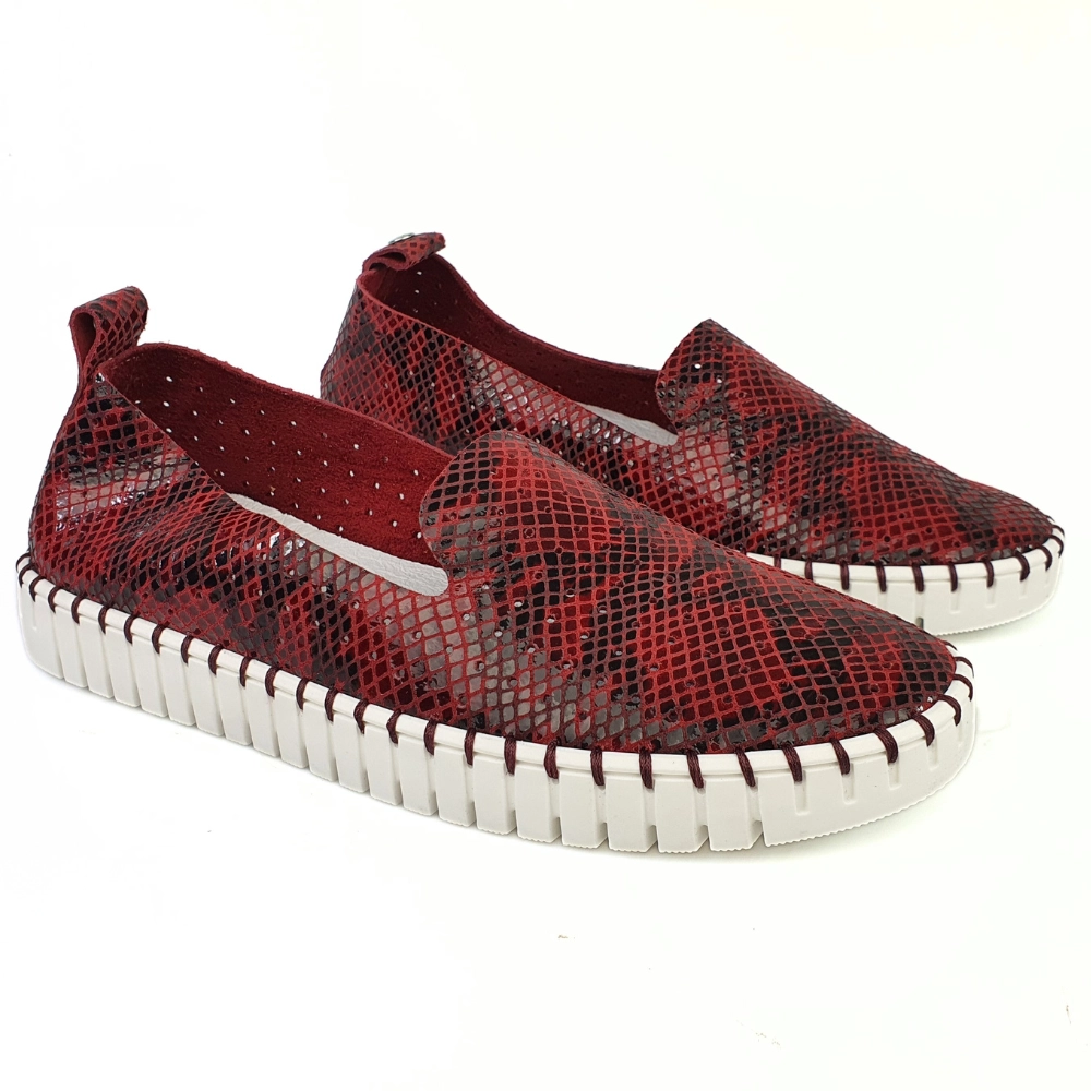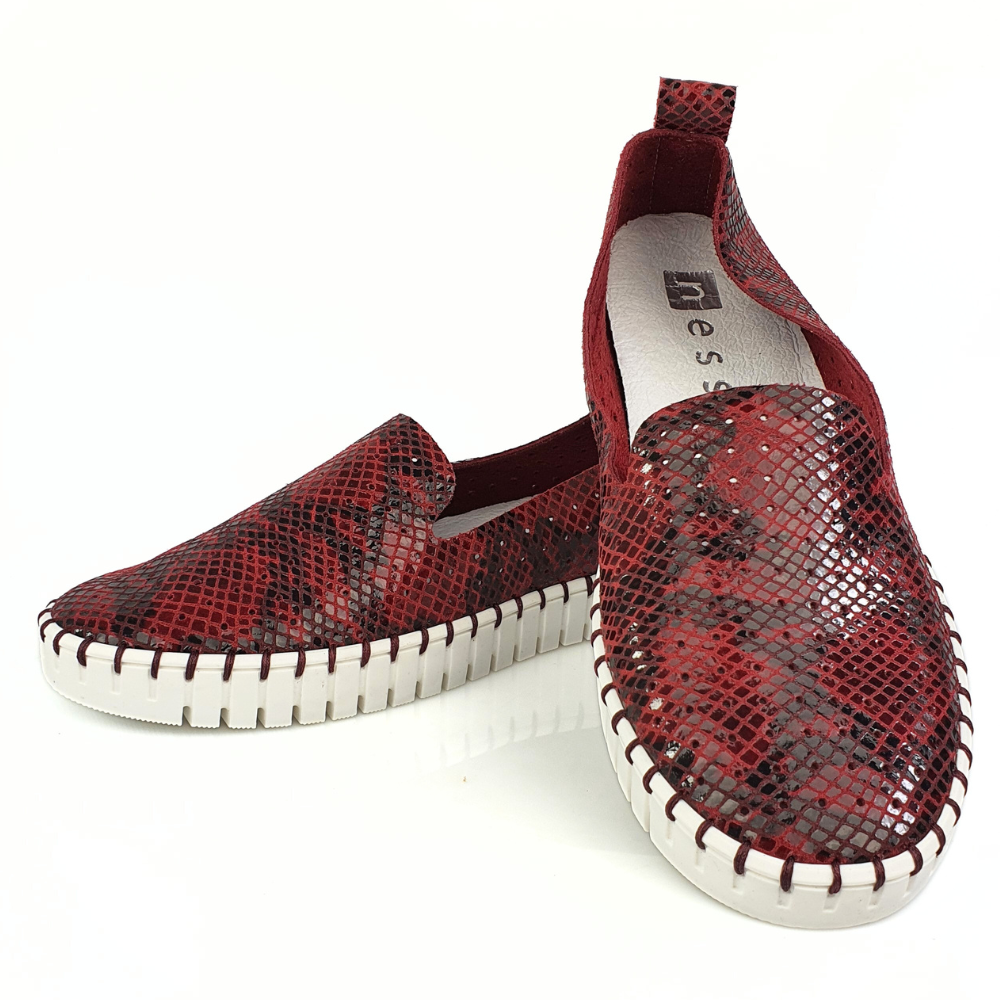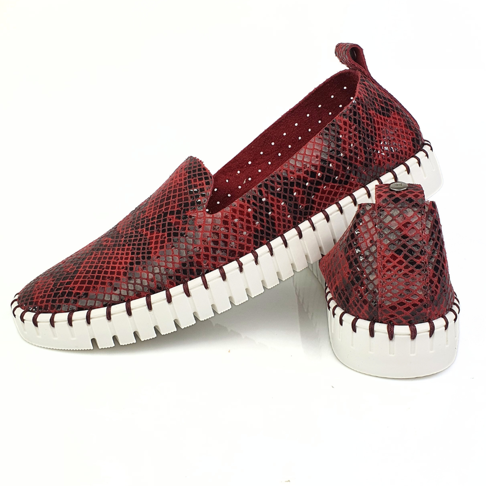 Miękkie mokasyny damskie skórzane bordo wzór wąż Nessi 18390