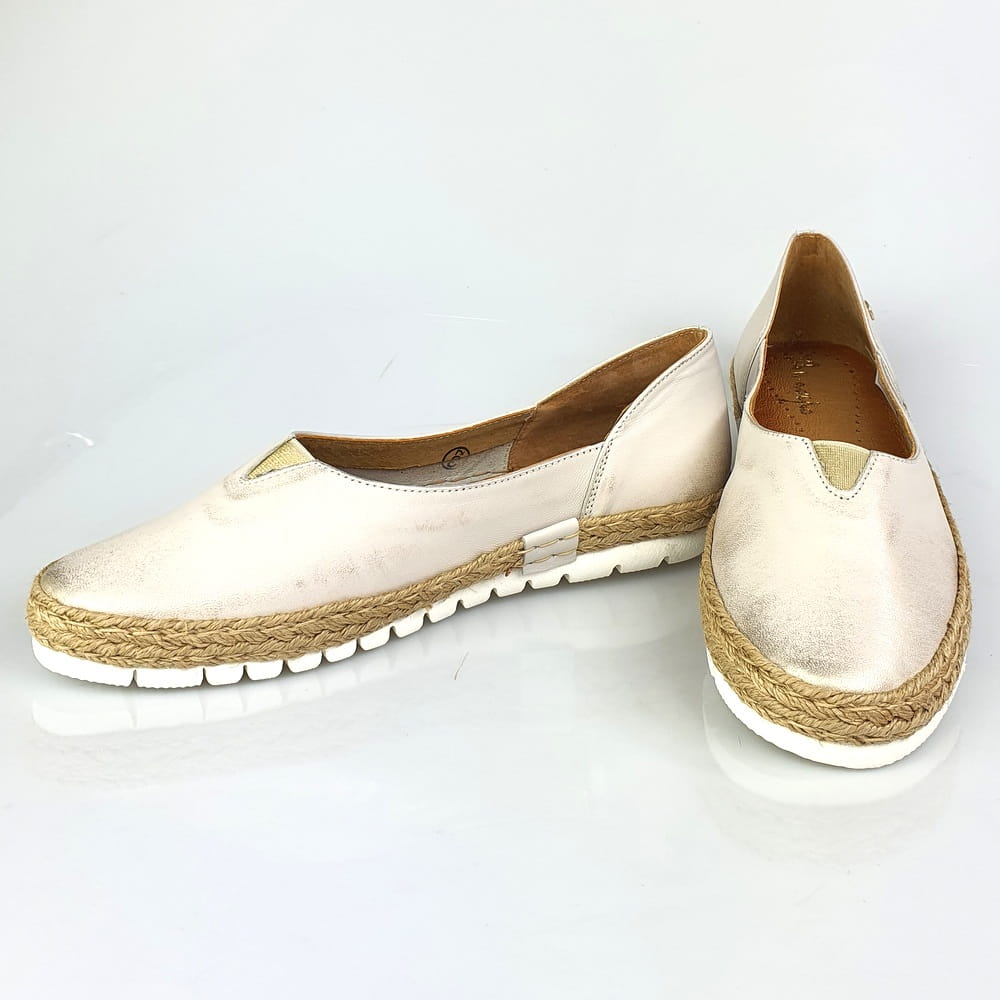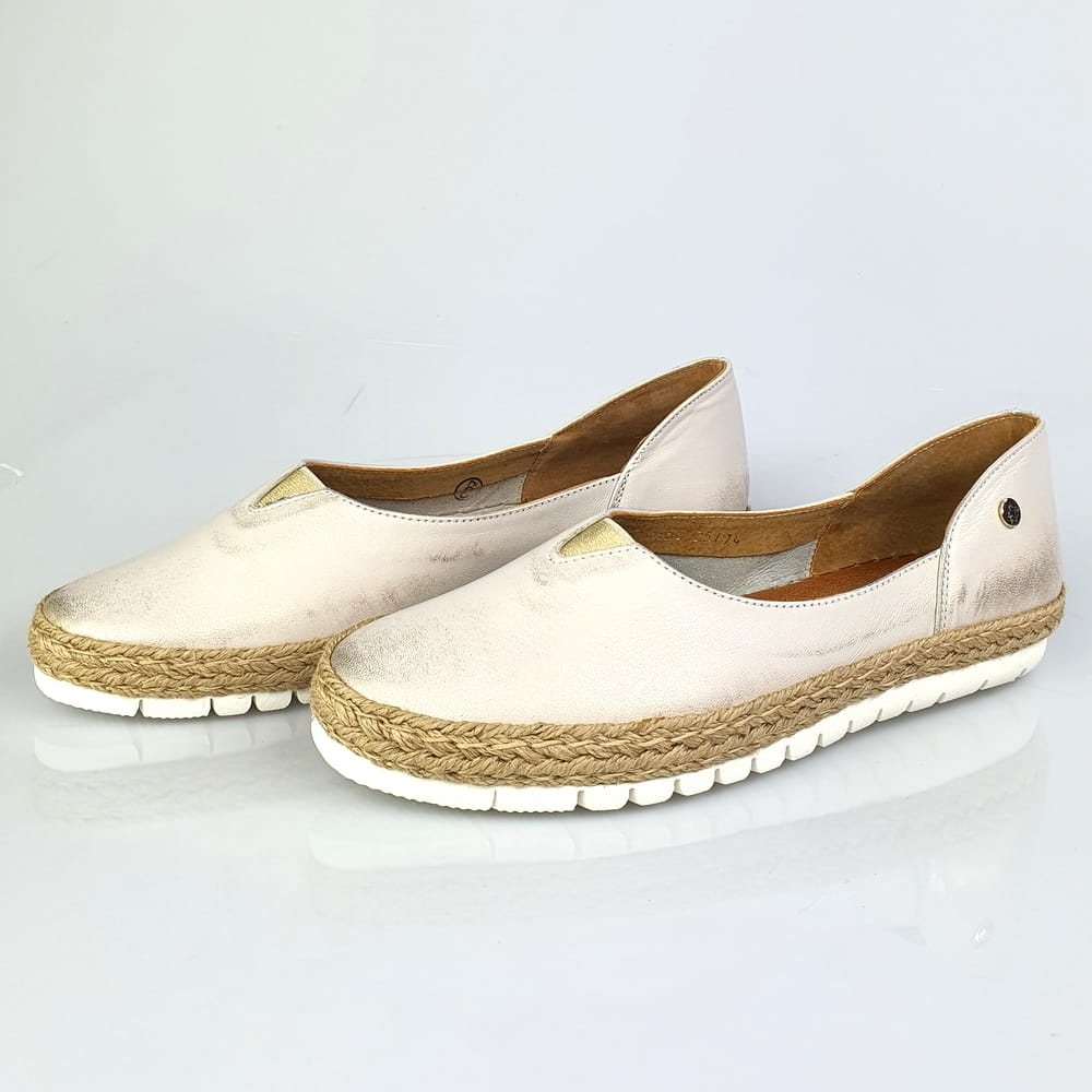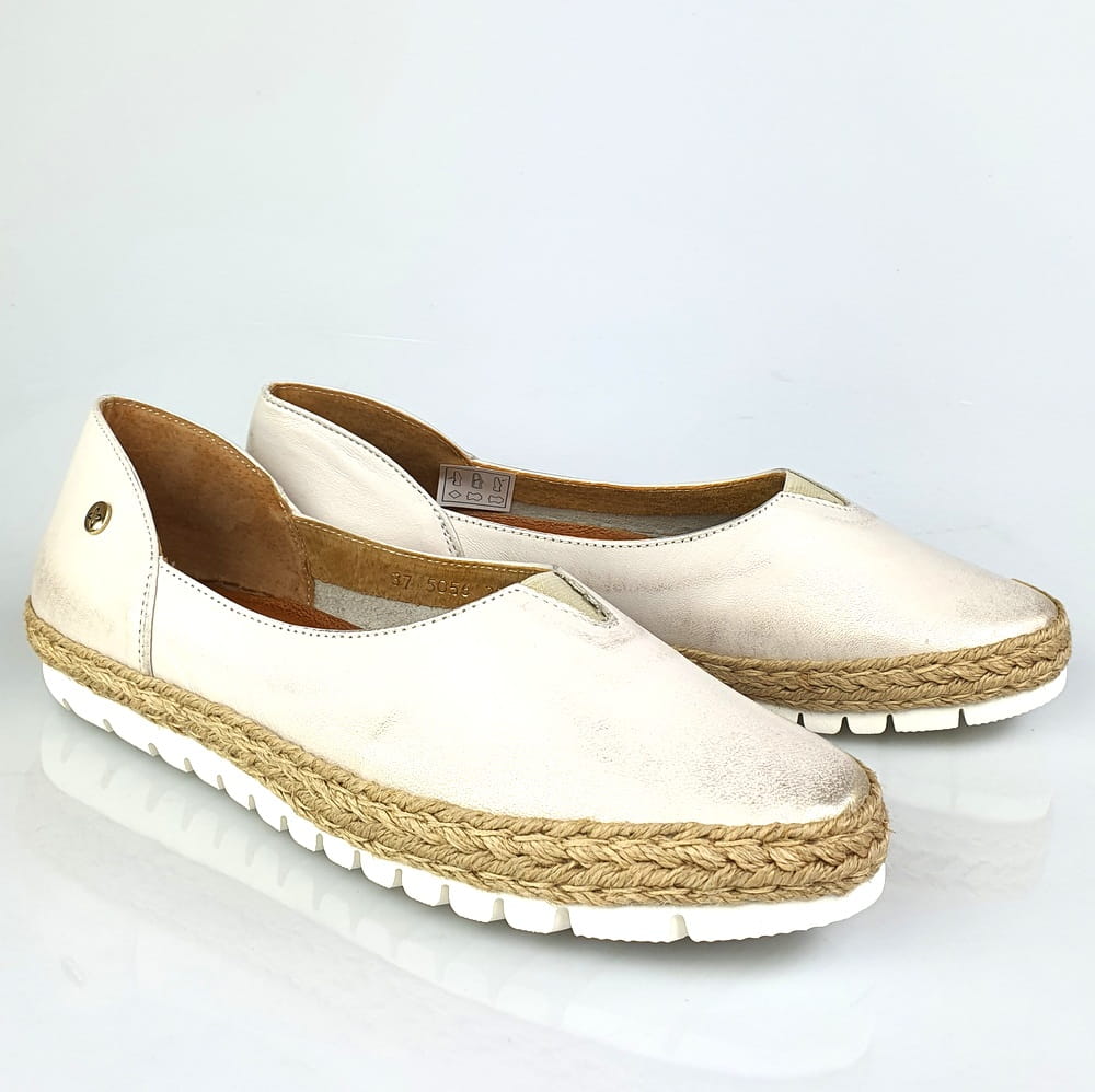 Zaletą mokasynów w modelu 05056 jest cholewka wykonana z naturalnej skóry licowej, która zapewni stopom wygodę i przewiewność. Miękka, dobrze uginająca się podeszwa pozwoli na długie i wygodne użytkowanie. Twoje stopy odczują komfort i miękkość wkładki ze skóry naturalnej. Piękna kolorystyka: na białej podeszwie złocona cholewka. Wokół cholewki ozdoba w postaci plecionego sznurka - to klasyka espadryli. Dodatkowym atutem tych mokasynów jest wszyta na górze cholewki gumeczka, która "pracuje" podczas chodzenia i przynosi ulgę jeśli stopom zdarzy się spuchnąć.
