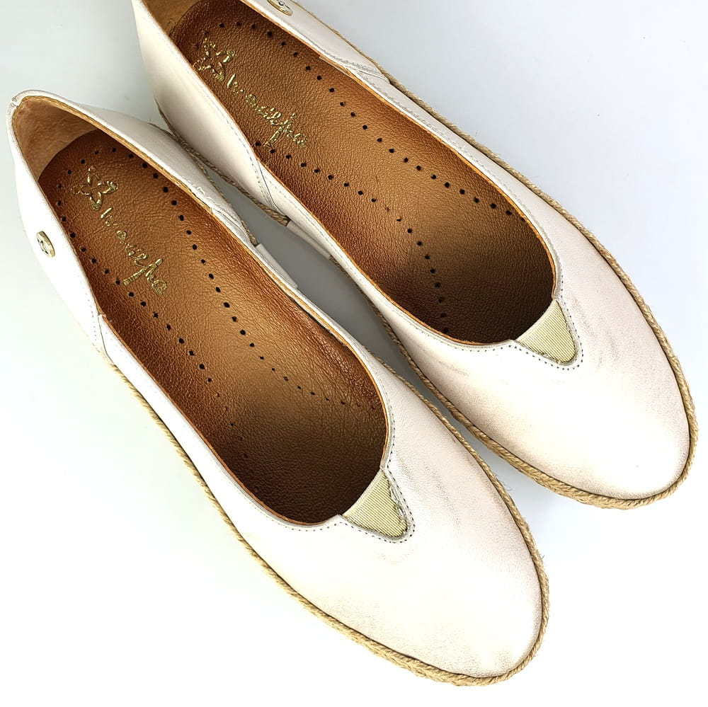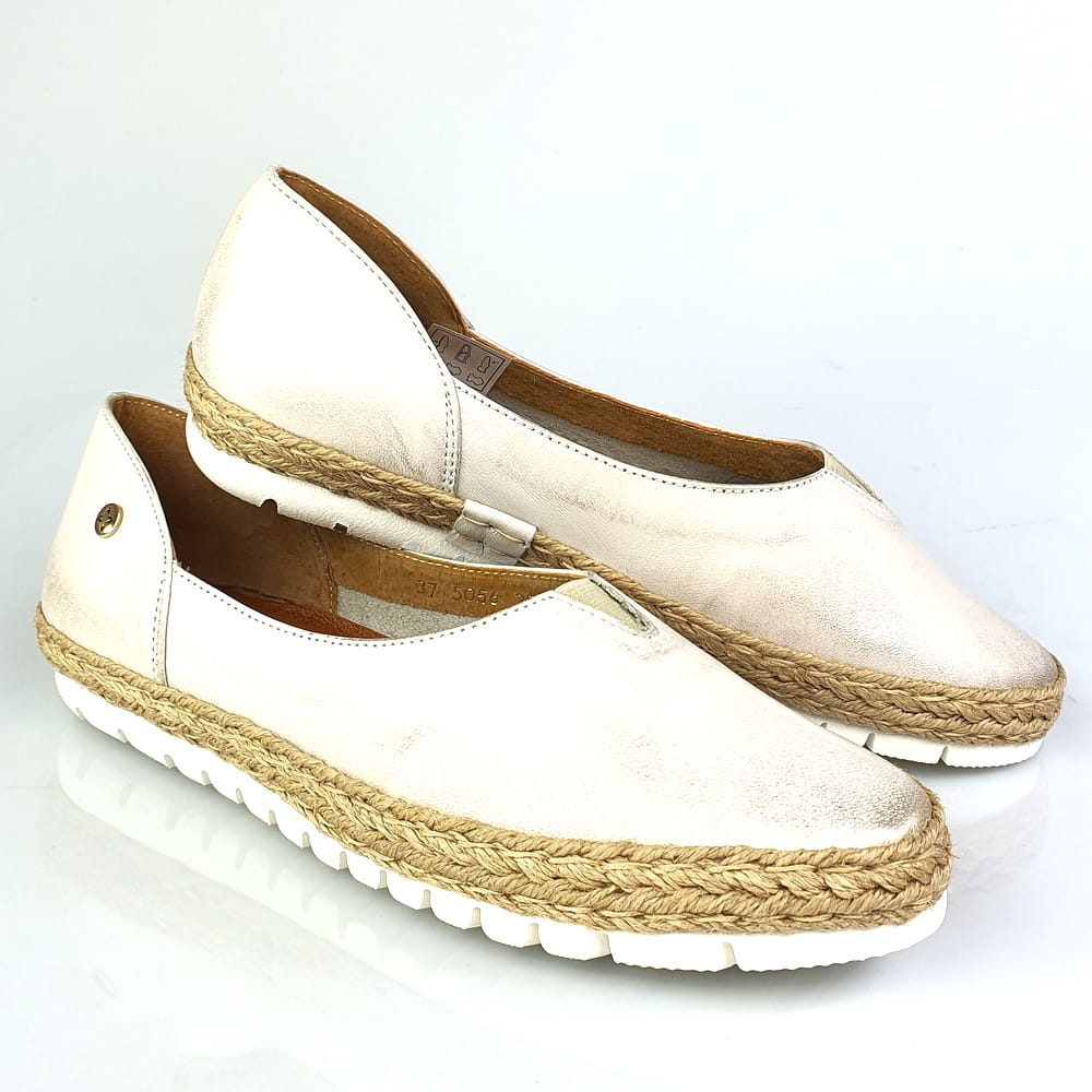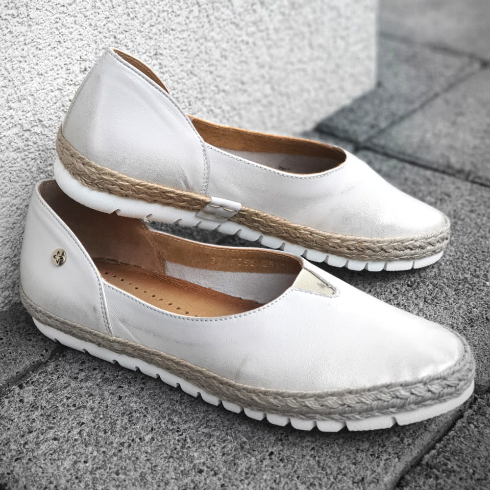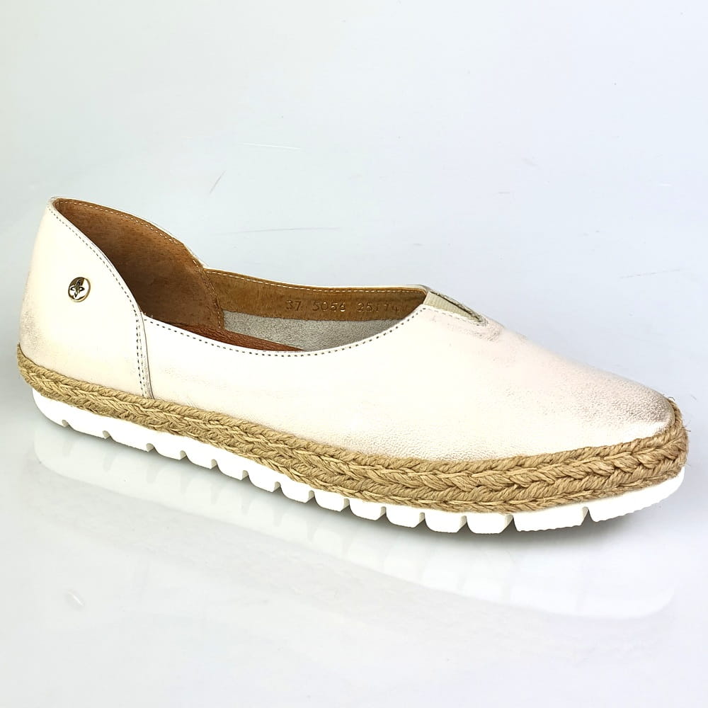Zaletą mokasynów w modelu 05056 jest cholewka wykonana z naturalnej skóry licowej, która zapewni stopom wygodę i przewiewność. Miękka, dobrze uginająca się podeszwa pozwoli na długie i wygodne użytkowanie. Twoje stopy odczują komfort i miękkość wkładki ze skóry naturalnej. Piękna kolorystyka: na białej podeszwie złocona cholewka. Wokół cholewki ozdoba w postaci plecionego sznurka - to klasyka espadryli. Dodatkowym atutem tych mokasynów jest wszyta na górze cholewki gumeczka, która "pracuje" podczas chodzenia i przynosi ulgę jeśli stopom zdarzy się spuchnąć.