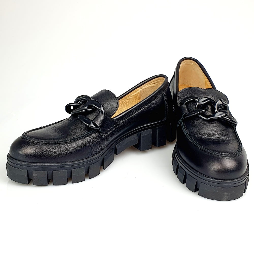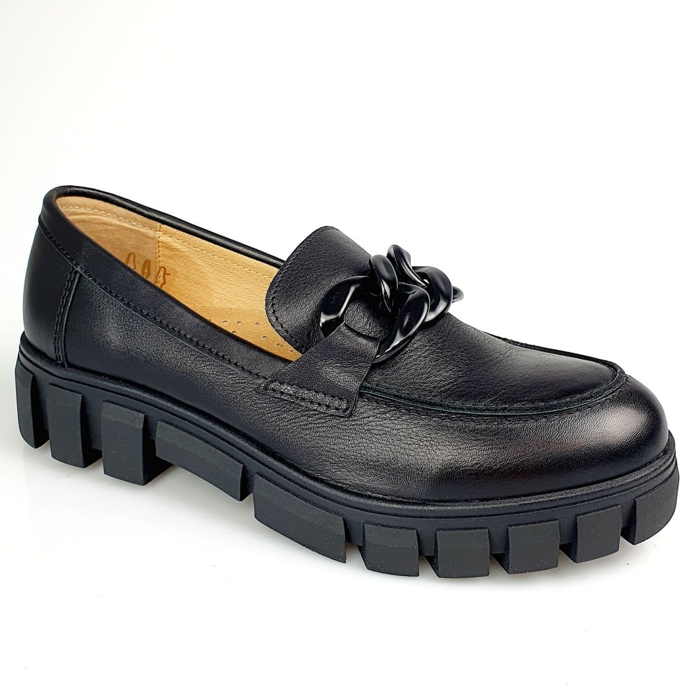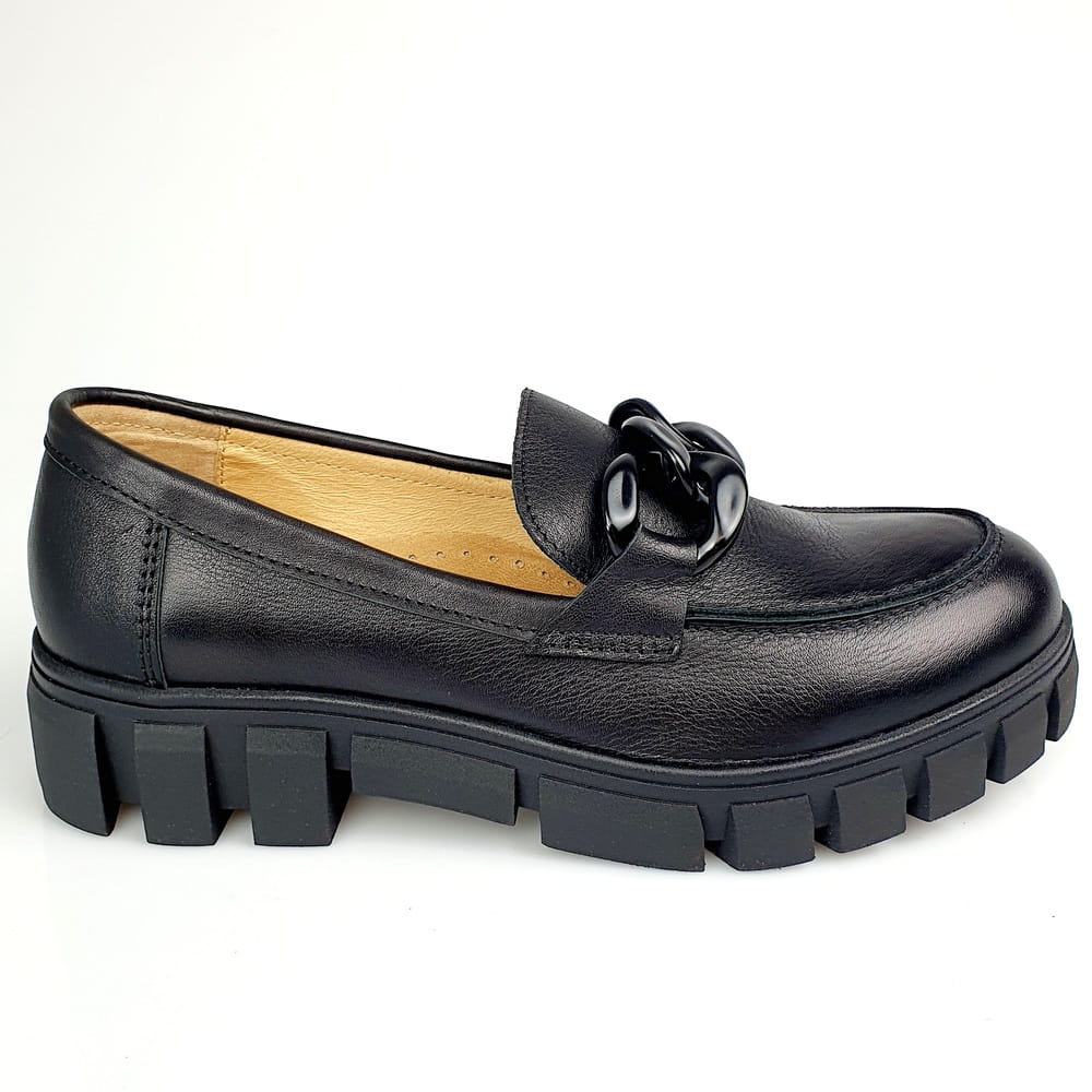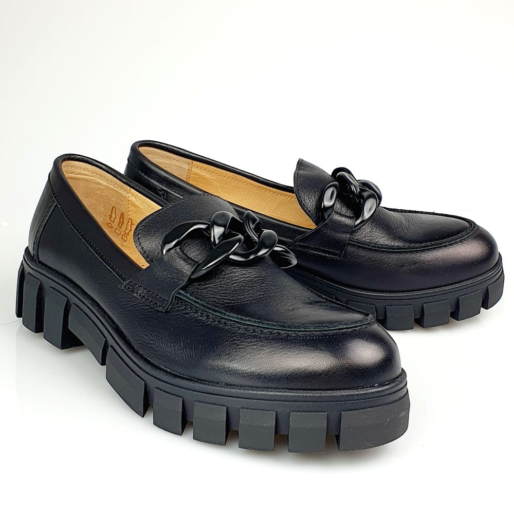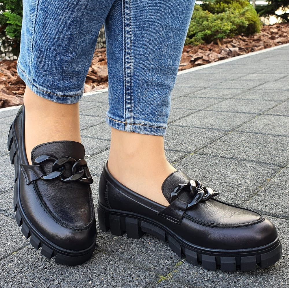 Model 23085 to dobry wybór dla kobiety aktywnej i nowoczesnej. Podkreślą Twój charakter i indywidualny styl. Duża ozdoba w postaci trzech ogniw łańcucha w kolorze ciemnego srebra dodaje butom blasku i niewątpliwego charakteru. Te skórzane mokasyny będą wspaniałym uzupełnieniem każdej stylizacji, pasują do spodni, jak i spódnicy.