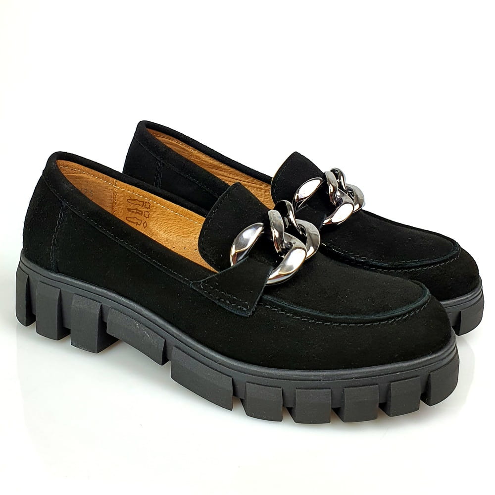 Model 23085 to dobry wybór dla kobiety aktywnej i nowoczesnej. Podkreślą Twój charakter i indywidualny styl. Duża ozdoba w postaci trzech ogniw łańcucha w kolorze ciemnego srebra dodaje butom blasku i niewątpliwego charakteru. Te skórzane mokasyny będą wspaniałym uzupełnieniem każdej stylizacji, pasują do spodni, jak i spódnicy.