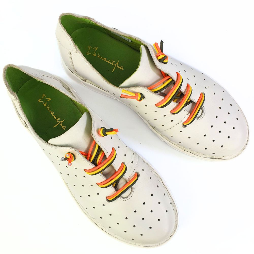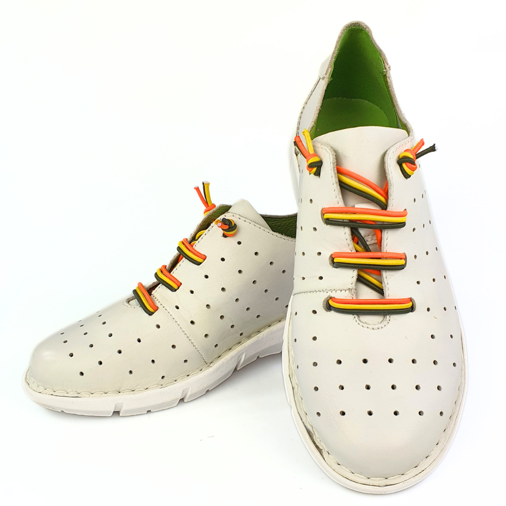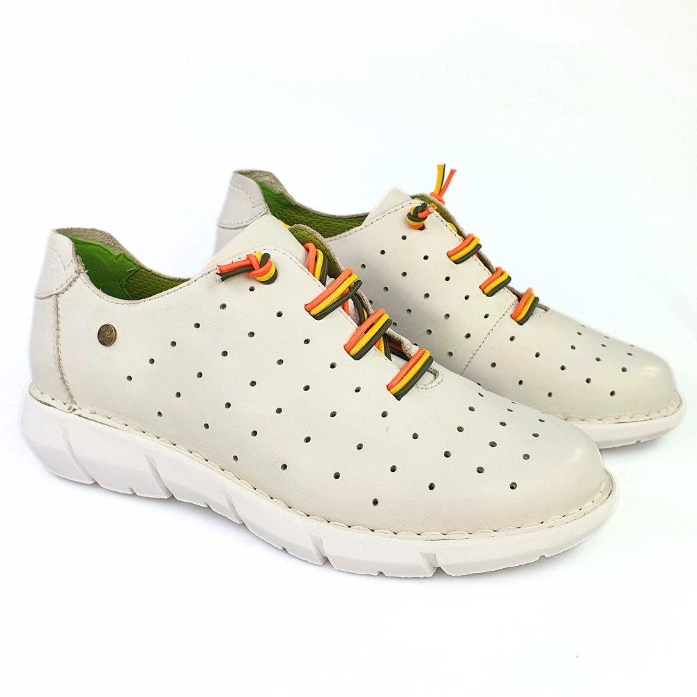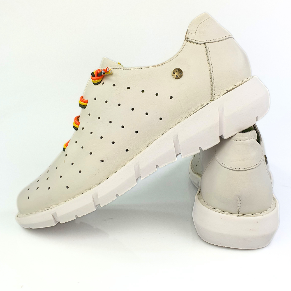 Najważniejszą cechą sportowych butów modelu 6811 jest wygodna gruba podeszwa, która jest miękka i świetnie pracuje podczas chodzenia - w tych butach możesz spędzić cały dzień bez zmęczenia, w pracy czy podczas wolnych chwil. Te półbuty Maciejka są wykonane z połączenia naturalnej licowej skóry w kolorze białym w odcieniu śmietanowym, wnętrze w kolorze zielonym. Buty są wsuwane, zamiast sznurówek zastosowano kolorowe gumki.