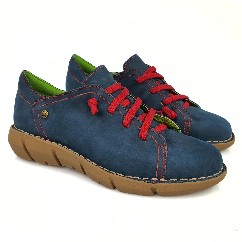 Najważniejszą cechą sportowych butów modelu 6818 jest wygodna gruba podeszwa, która jest miękka i świetnie pracuje podczas chodzenia - w tych butach możesz spędzić cały dzień bez zmęczenia, w pracy czy podczas wolnych chwil. Te półbuty Maciejka są wykonane z naturalnej nubukowej skóry w kolorze granatowym, wnętrze w kolorze zielonym. Buty są wsuwane, zamiast sznurówek zastosowano czerwone gumki.