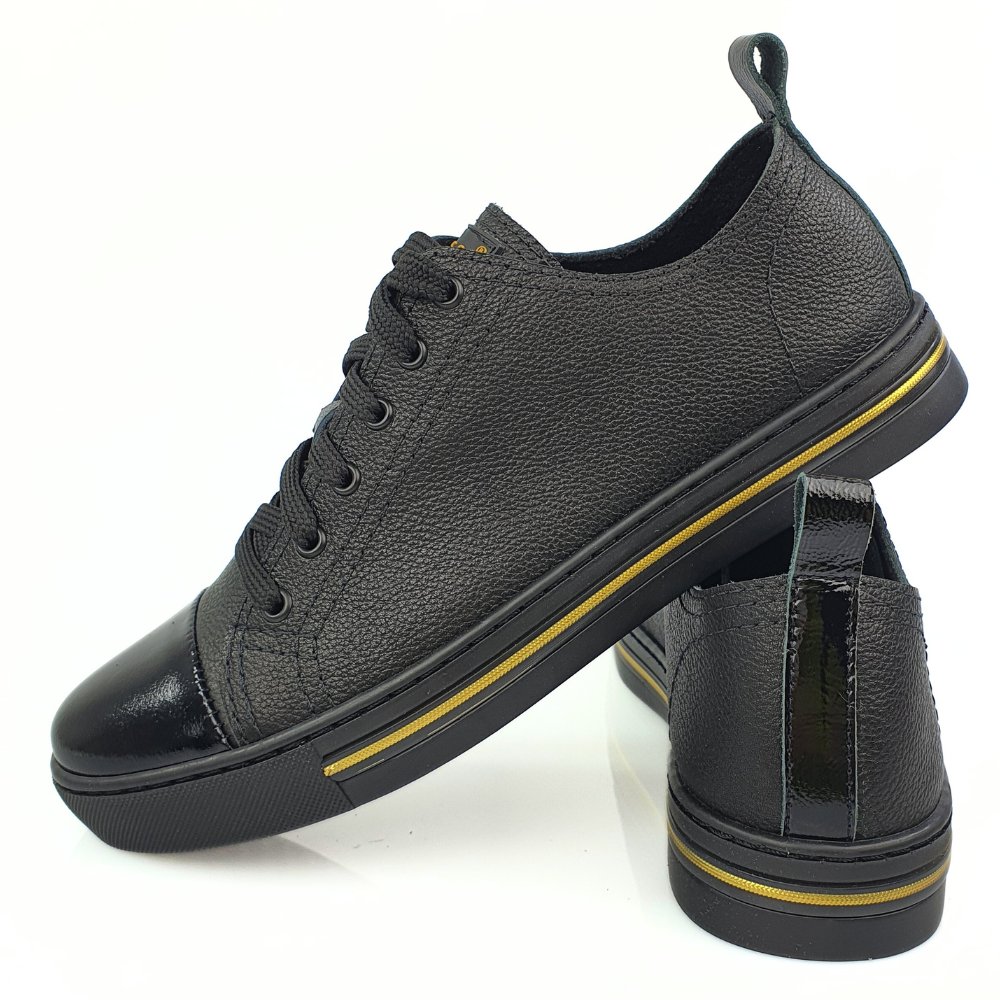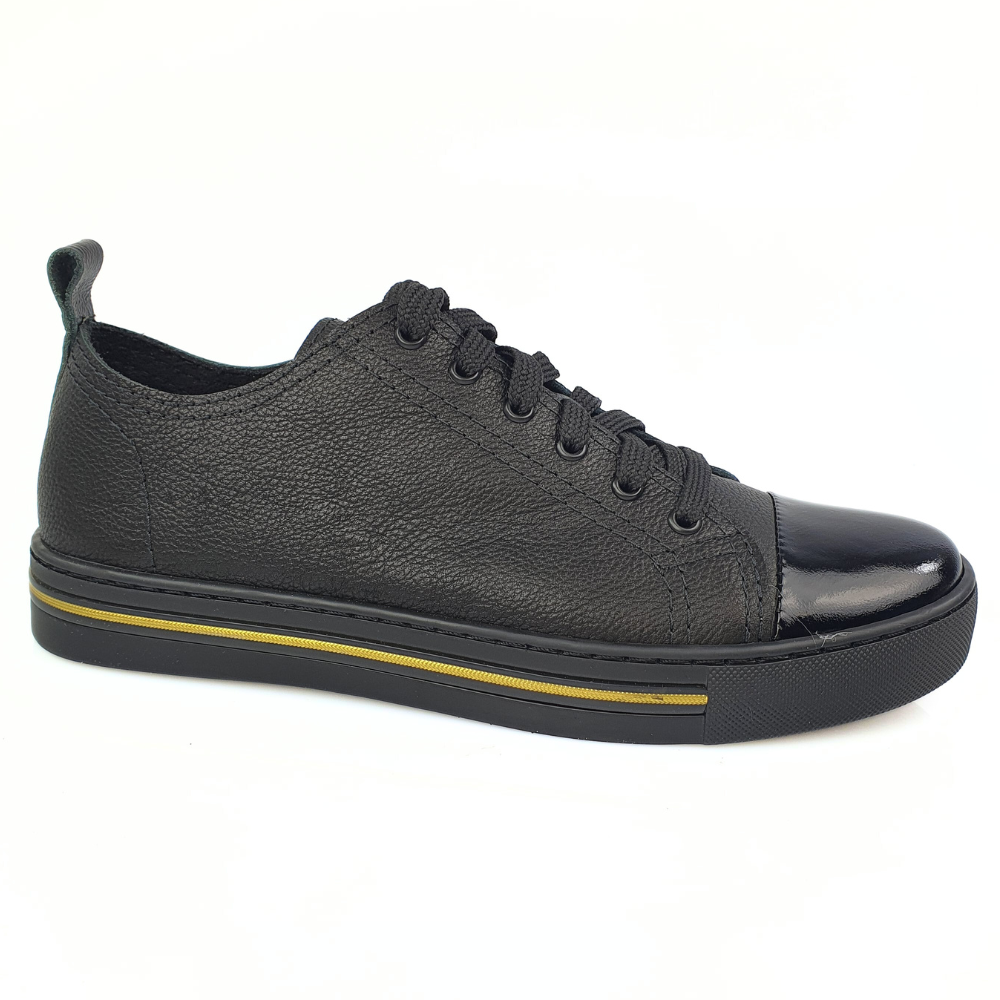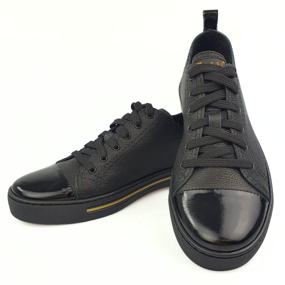 Najważniejszą cechą sportowych butów modelu 22695 jest bardzo wygodna podeszwa- już sprawdzona przez nasze klientki! Podeszwa jest miękka i świetnie pracuje podczas chodzenia - w tych butach możesz spędzić cały dzień bez zmęczenia, w pracy czy podczas wolnych chwil. Ten model jest wygodniejszy niż trampki. Sportowe buty NESSI są oczywiście wykonane z naturalnej skóry licowej w kolorze czarnym z lakierowanym czubkiem.
