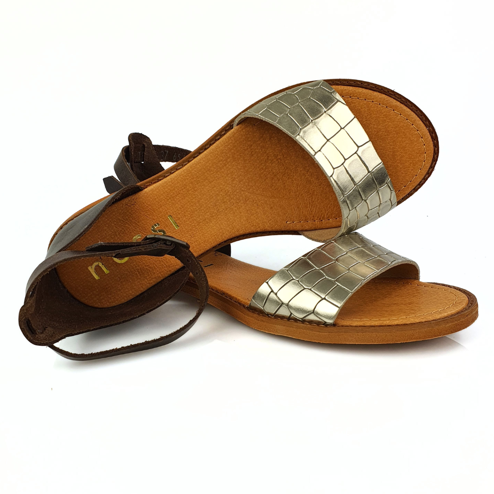 Zaletą sandałów w modelu 18382 jest doskonale dopracowany wzór- sandałki dobrze dopasowują się do stopy i świetnie się na niej układają podczas chodzenia. Sandałki wykonane są z naturalnej skóry licowej, która zapewni stopom wygodę i przewiewność. Palce są odkryte, pięta zakryta. Płaski obcas to kolejny atut tych sandałków. Sandałki Nessi zapinane są na pasek wokół kostki ze sprzączką. Miękka, dobrze uginająca się podeszwa pozwoli na długie i wygodne użytkowanie. Twoje stopy odczują komfort i miękkość wkładki ze skóry naturalnej. Połączenie koloru brązowego i złotego to klasyka. Buty są eleganckie, a jednocześnie nowoczesne i bardzo wygodne.