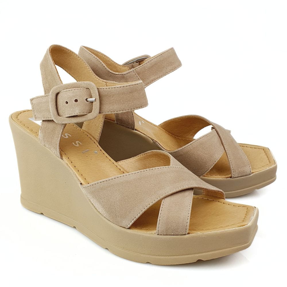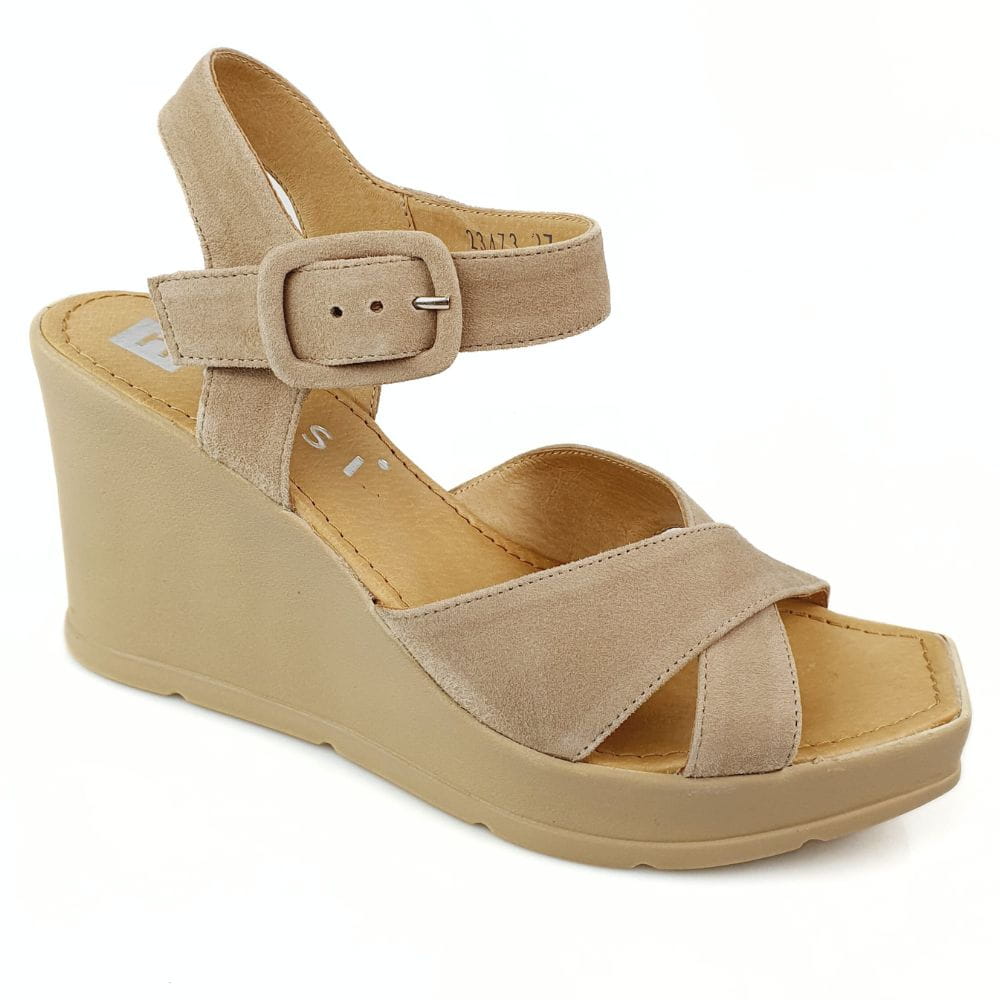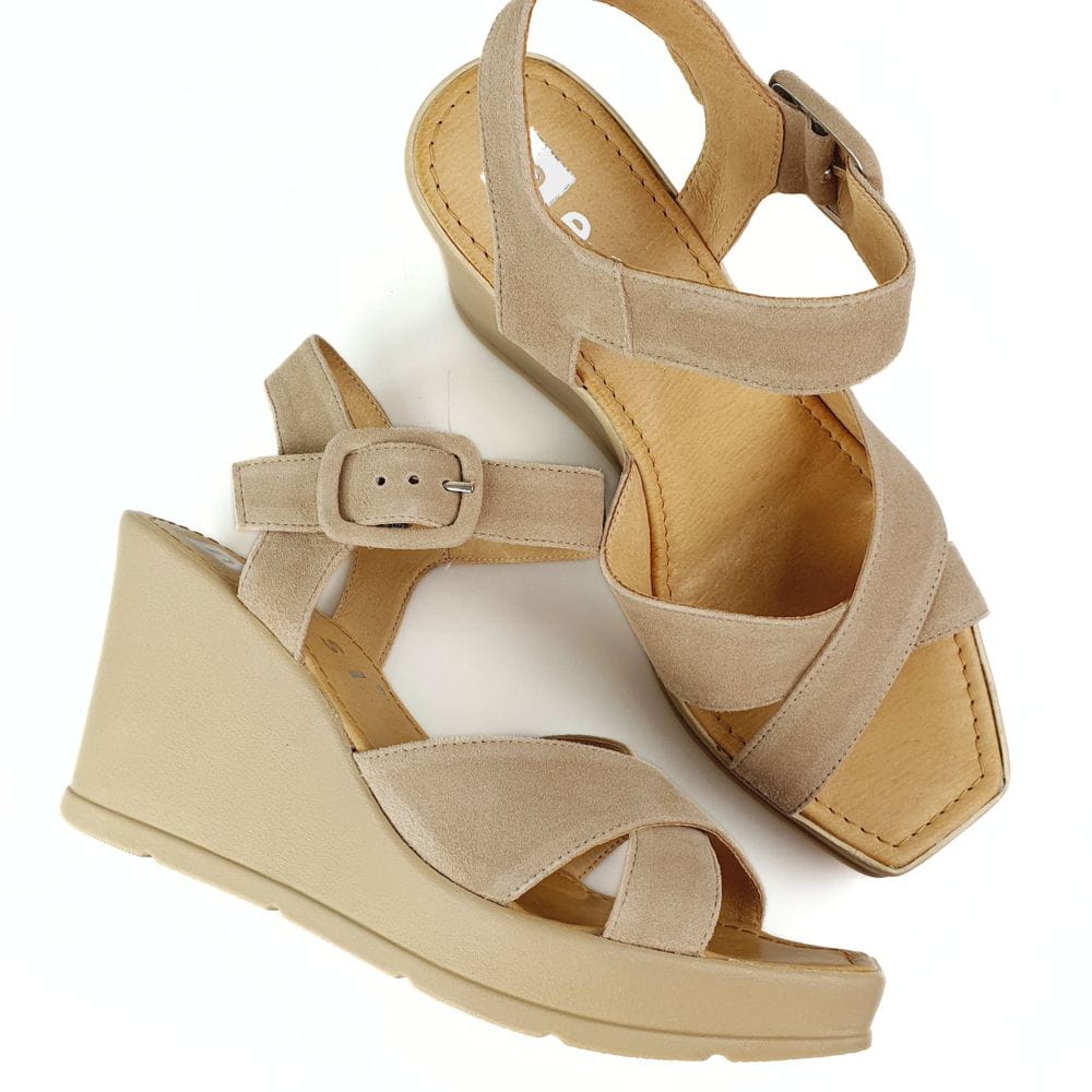 Sandałki na koturnie beżowe skóra welurowa Nessi 23473