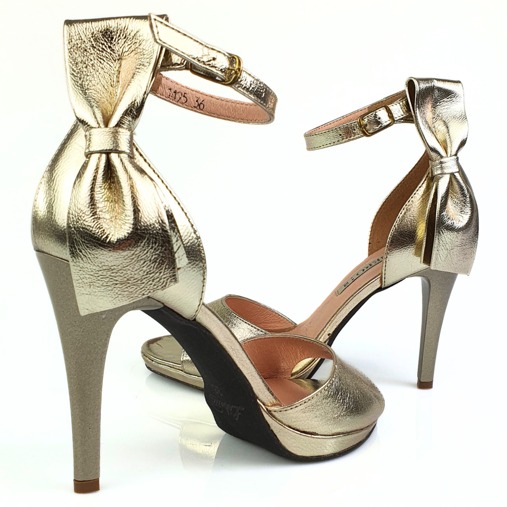 Zaletą sandałek w modelu 1495 jest cholewka wykonana z naturalnej skóry licowej, która zapewni stopom wygodę i przewiewność. Delikatny pasek w kolorze złotym tworzy wspaniałą ozdobę dla kobiecej stopy. Twoje stopy odczują komfort i miękkość wkładki ze skóry naturalnej. Buty są bardzo dobrze wyprofilowane, stabilny obcas szpilka ma wysokość ok. 9 cm, ale wygodę poprawia grubsza 1 cm podeszwa. Ozdobą jest kokarda przy pięcie. Buty są na stopy średniej tęgości G.