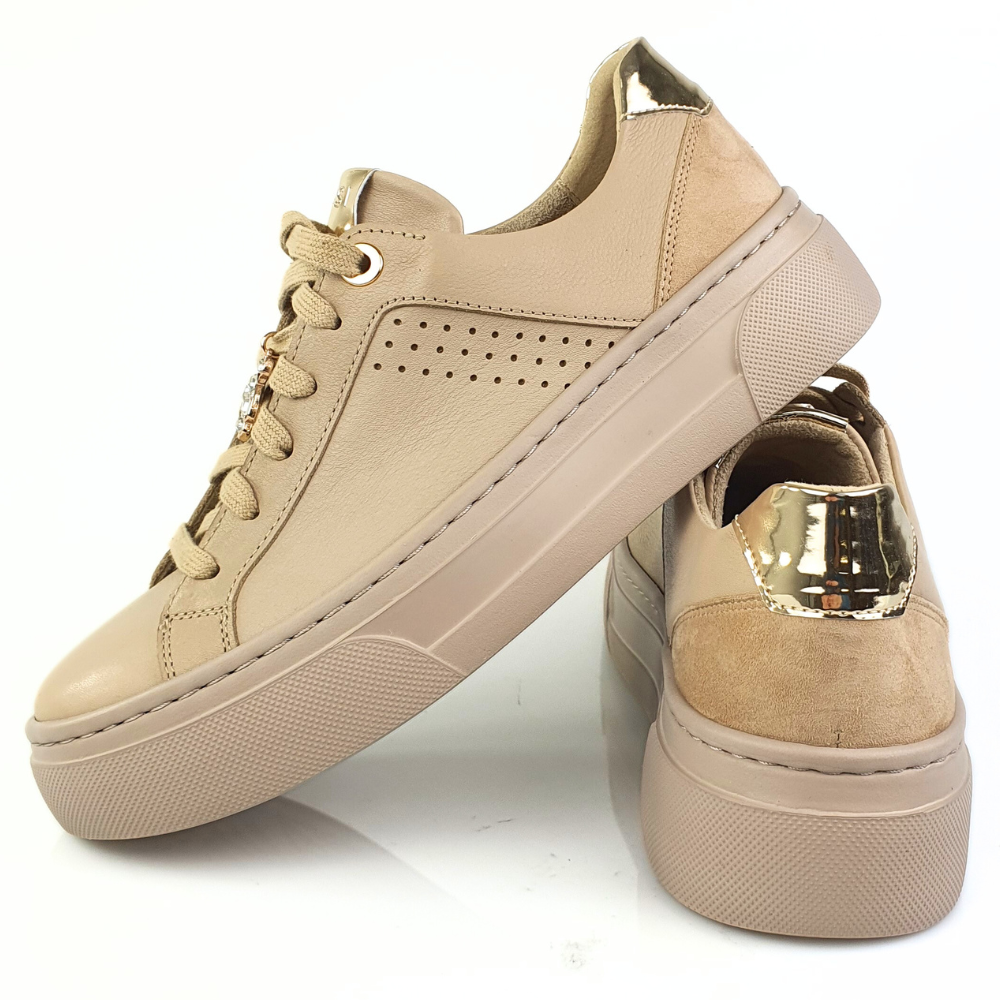 Najważniejszą cechą sportowych butów modelu 24585 jest wygodna gruba podeszwa (przód 3 cm, tył 4 cm) - już sprawdzona przez nasze klientki! Sportowe buty NESSI są oczywiście wykonane z naturalnej licowej skóry - kolor beżowy z ozdobą przy sznurówce: błyszczący miś.