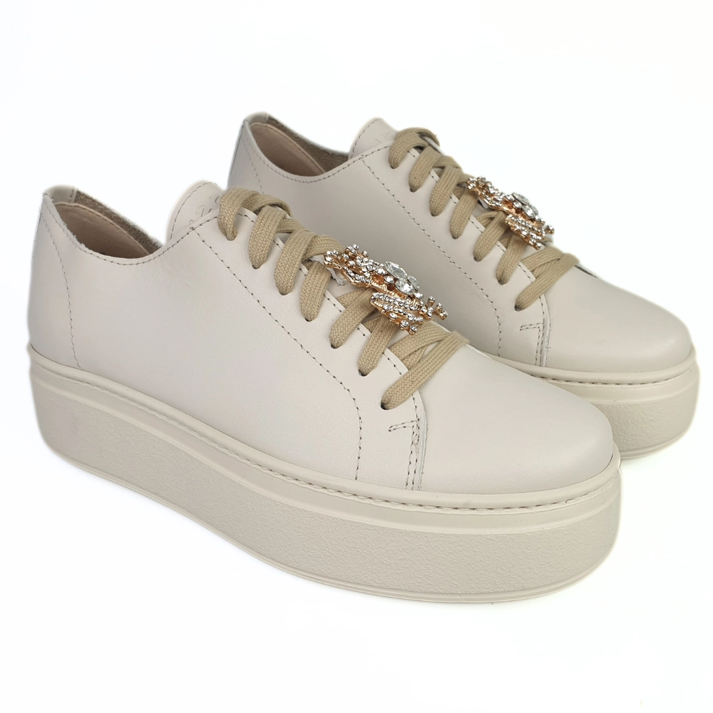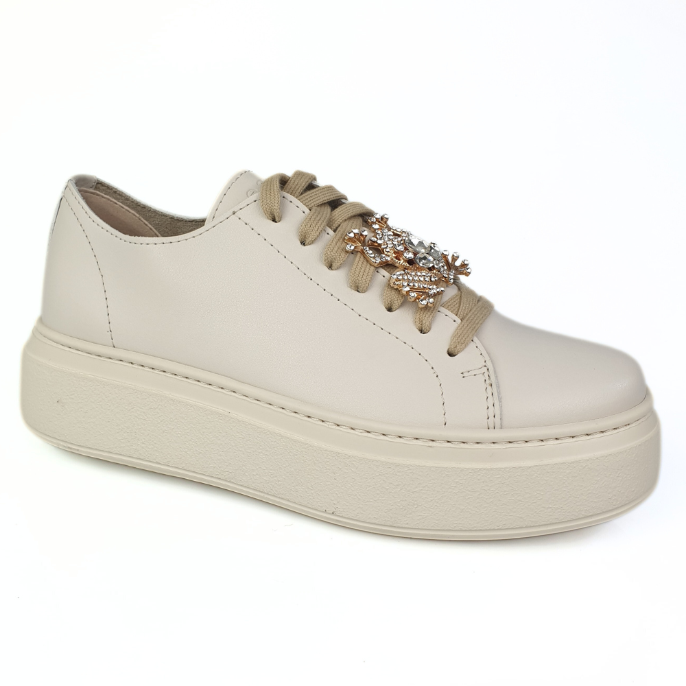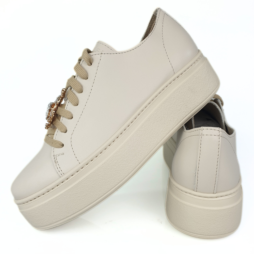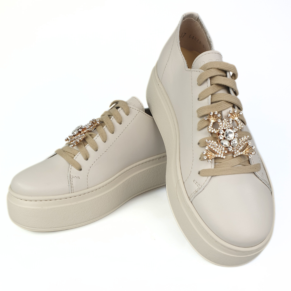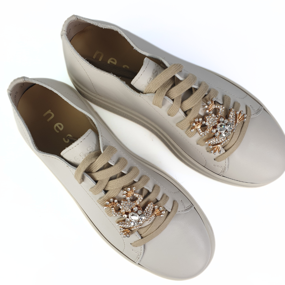 Najważniejszą cechą sportowych butów modelu 24700 jest wygodna gruba podeszwa (4 cm)- już sprawdzona przez nasze klientki! Sportowe buty NESSI są oczywiście wykonane z naturalnej licowej skóry - kolor beżowy z ozdobą przy sznurówce: błyszcząca żabka. Żabka jest z klipsem, można ją dowolnie zdejmować i zakładać.
