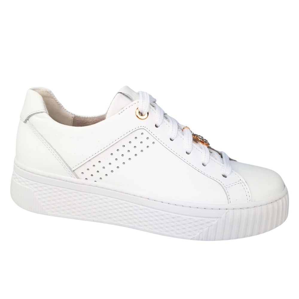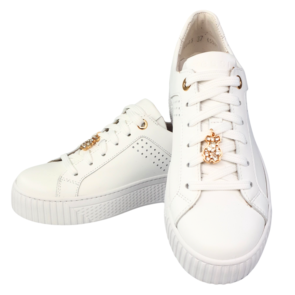 Najważniejszą cechą sportowych butów modelu 24585 jest wygodna gruba podeszwa (przód 3 cm, tył 4 cm) - już sprawdzona przez nasze klientki! Sportowe buty NESSI są oczywiście wykonane z naturalnej licowej skóry - kolor biały z ozdobą przy sznurówce: błyszczący miś.