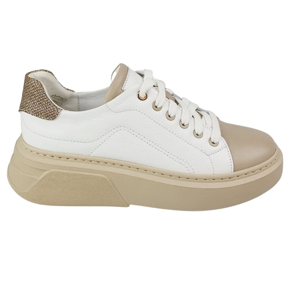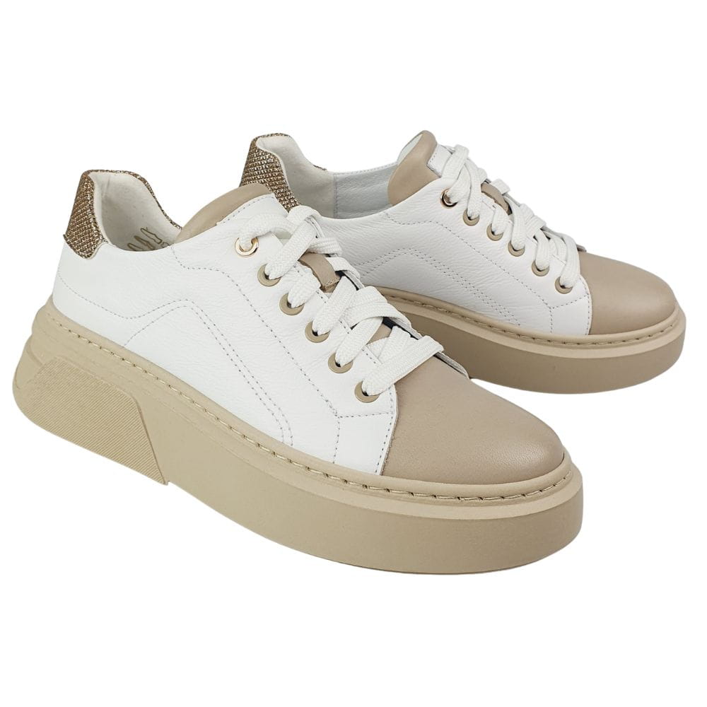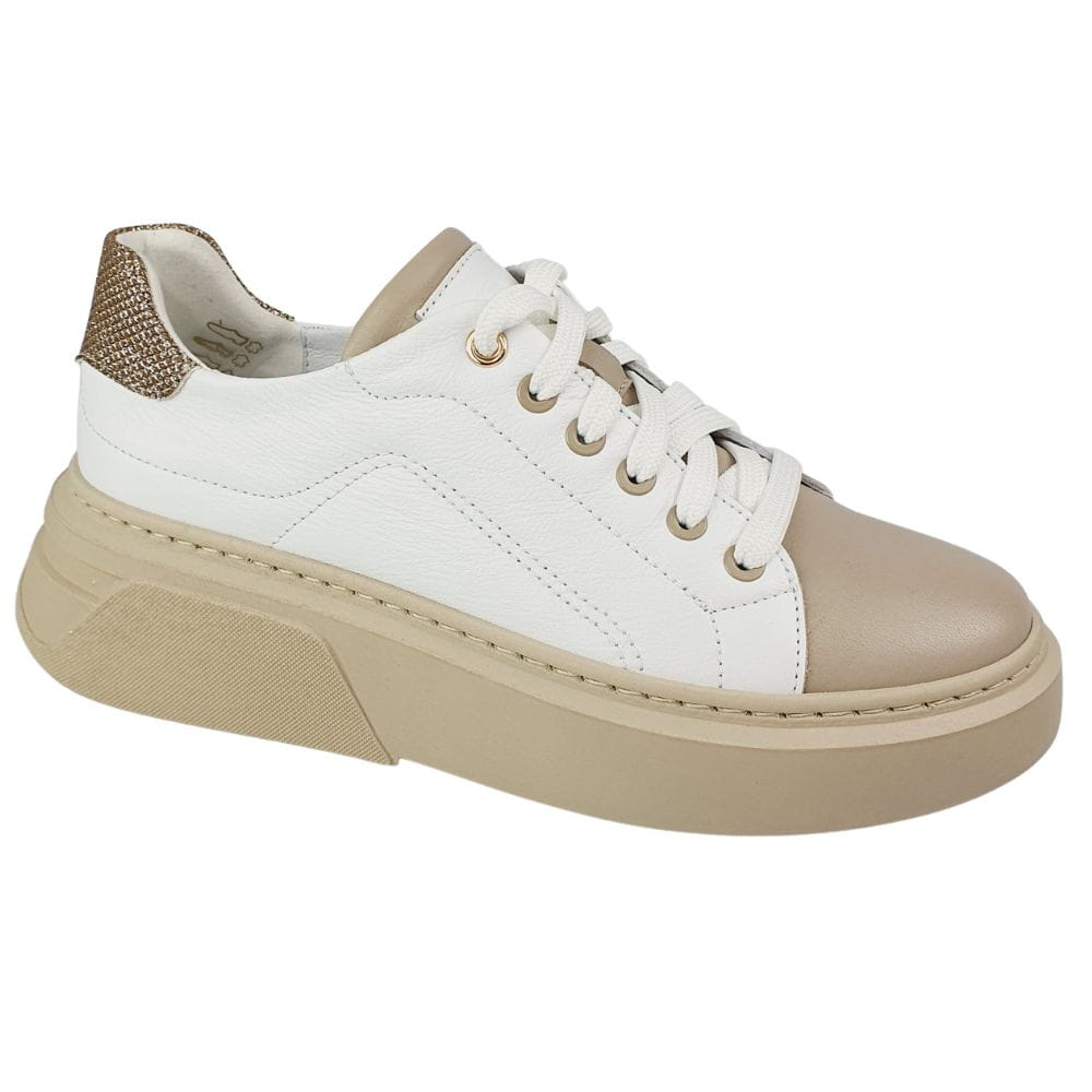 Najważniejszą cechą sportowych butów modelu 23412 jest wygodna gruba podeszwa (przód 3,5 cm, tył 5 cm)- już sprawdzona przez nasze klientki! Sportowe buty NESSI są oczywiście wykonane z naturalnej licowej skóry - kolor biały z beżowym ze złotą ozdobą nad piętą.