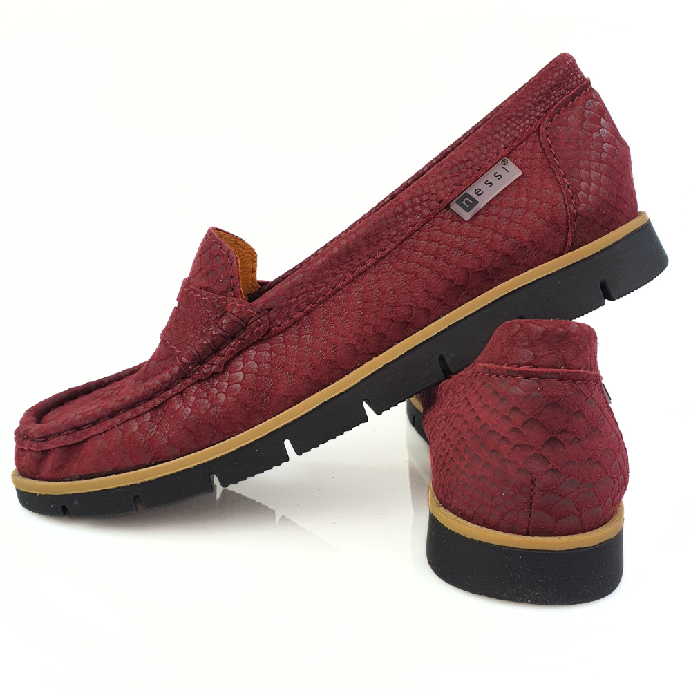 Wygodne mokasyny damskie bordo nubuk z wzorem